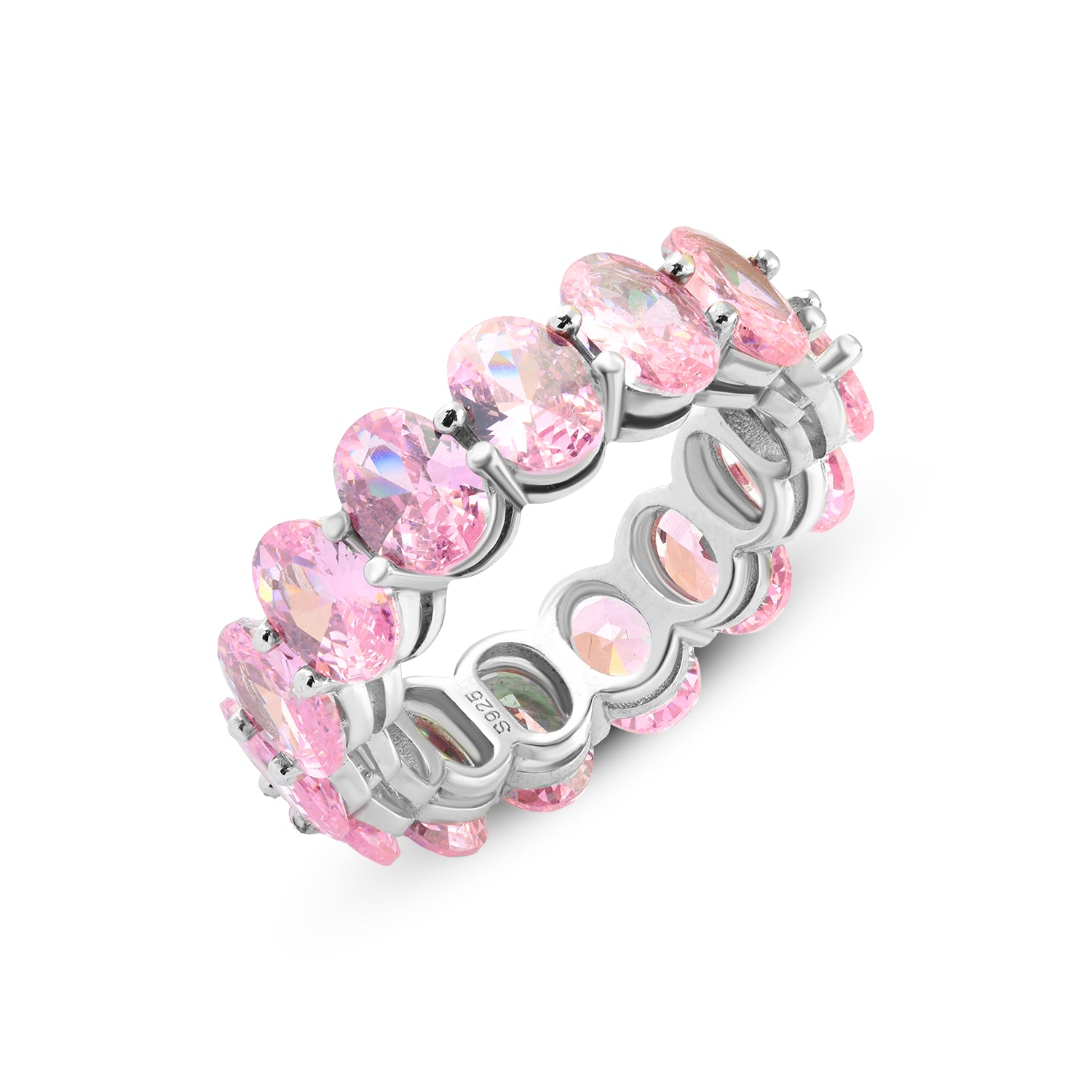 The ring features a brilliant row of sparkling pink stones encircling the entire band, reflecting light with a soft, radiant glow that adds a touch of sophistication and timeless beauty to your every look.