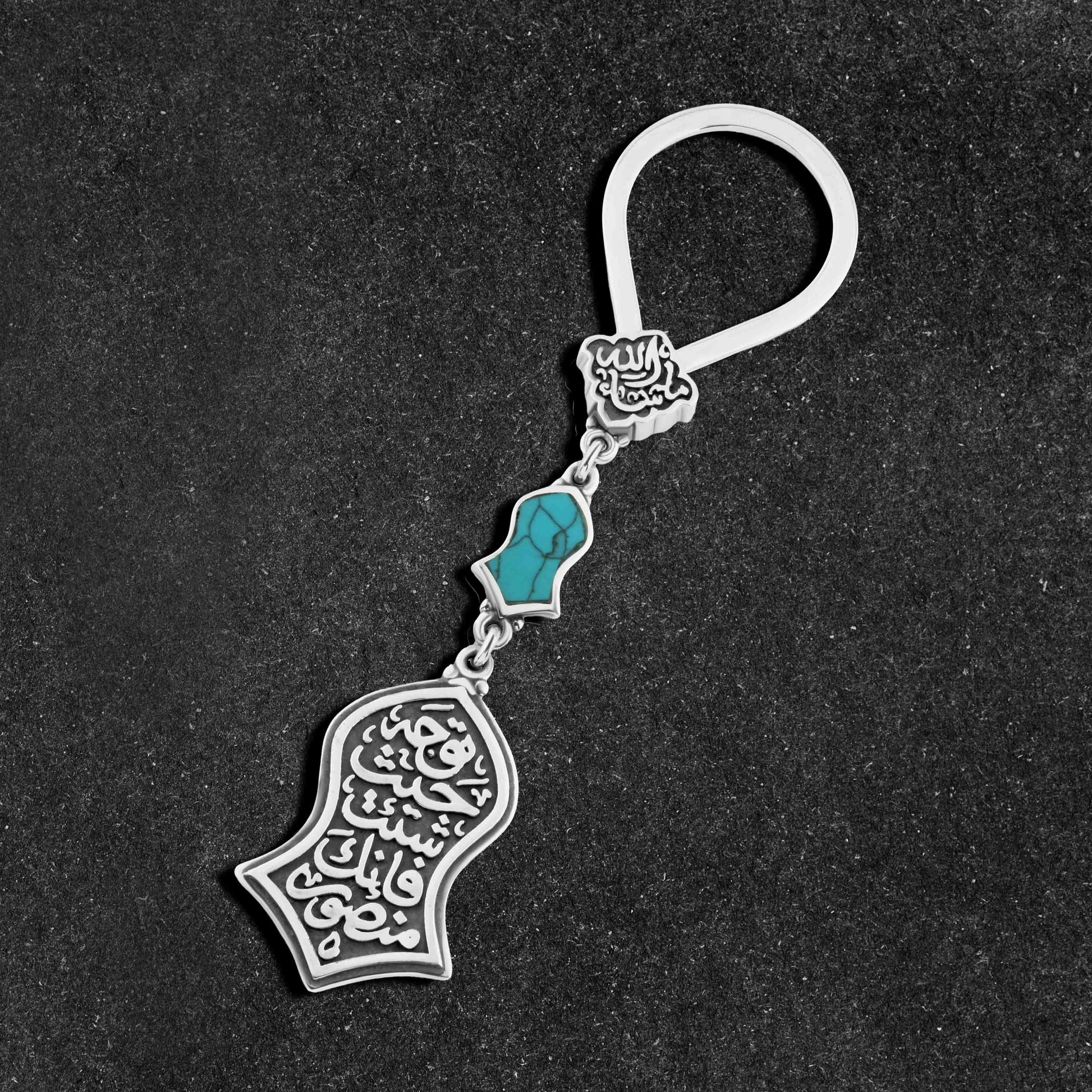 Engraved with the phrase “Go wherever you wish, for you are victorious” in elegant Arabic calligraphy, this keychain becomes more than just an accessory—it is a daily reminder of strength and confidence. The contrast between the shine of 800 silver and the vibrant blue turquoise creates a sophisticated and eye-catching look suitable for both men and women.
