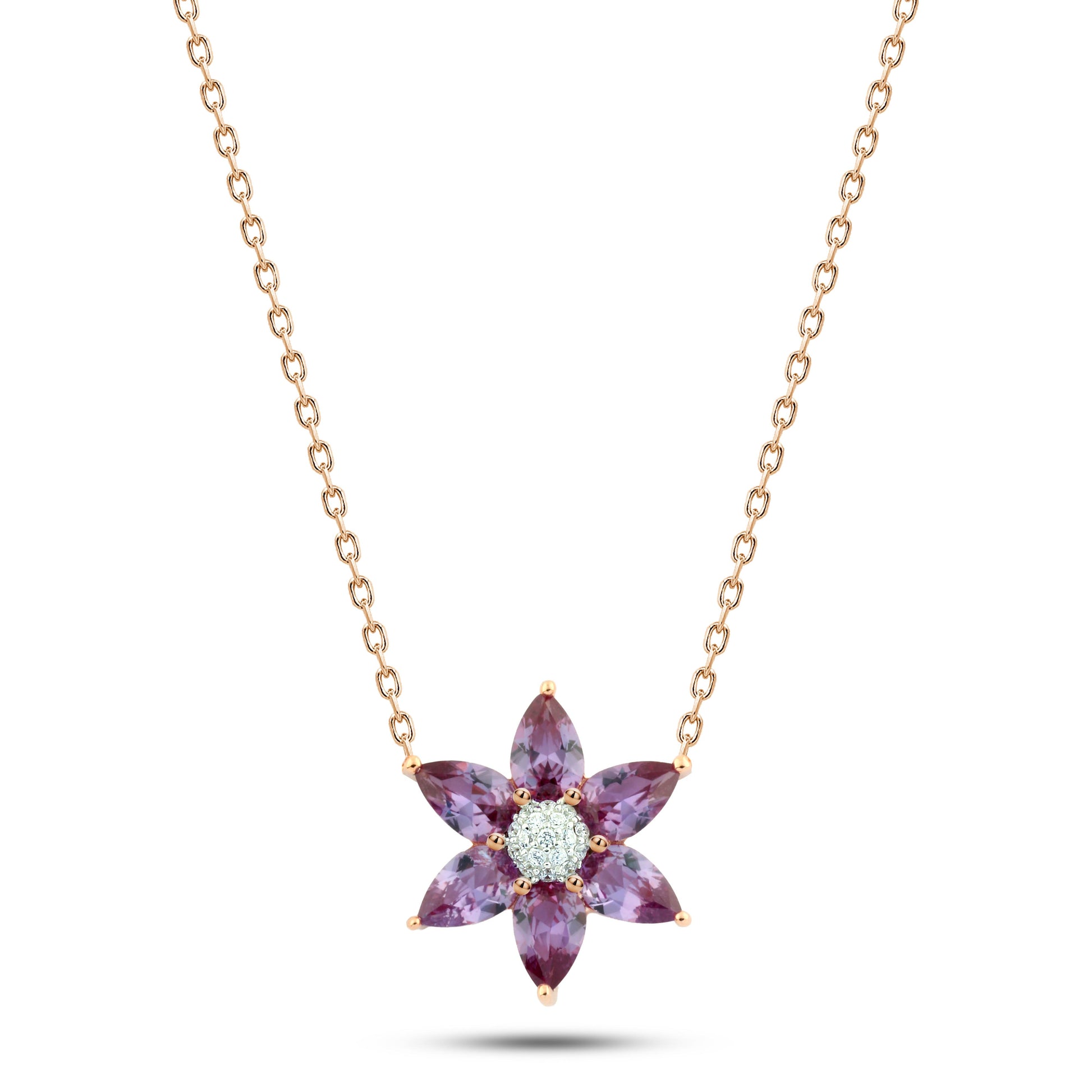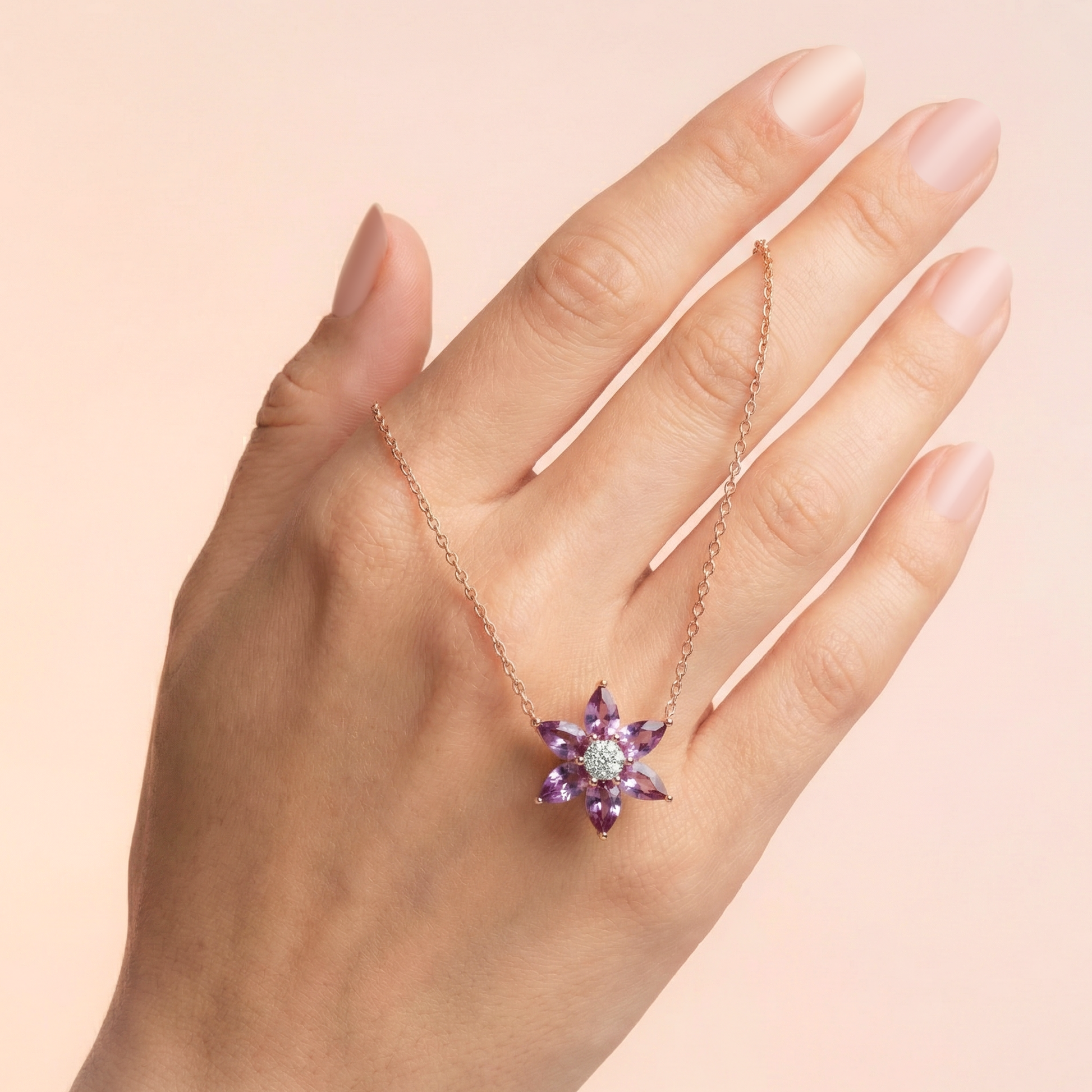 925 Silver Floral Necklace with Purple Stones – Rose Gold Plated