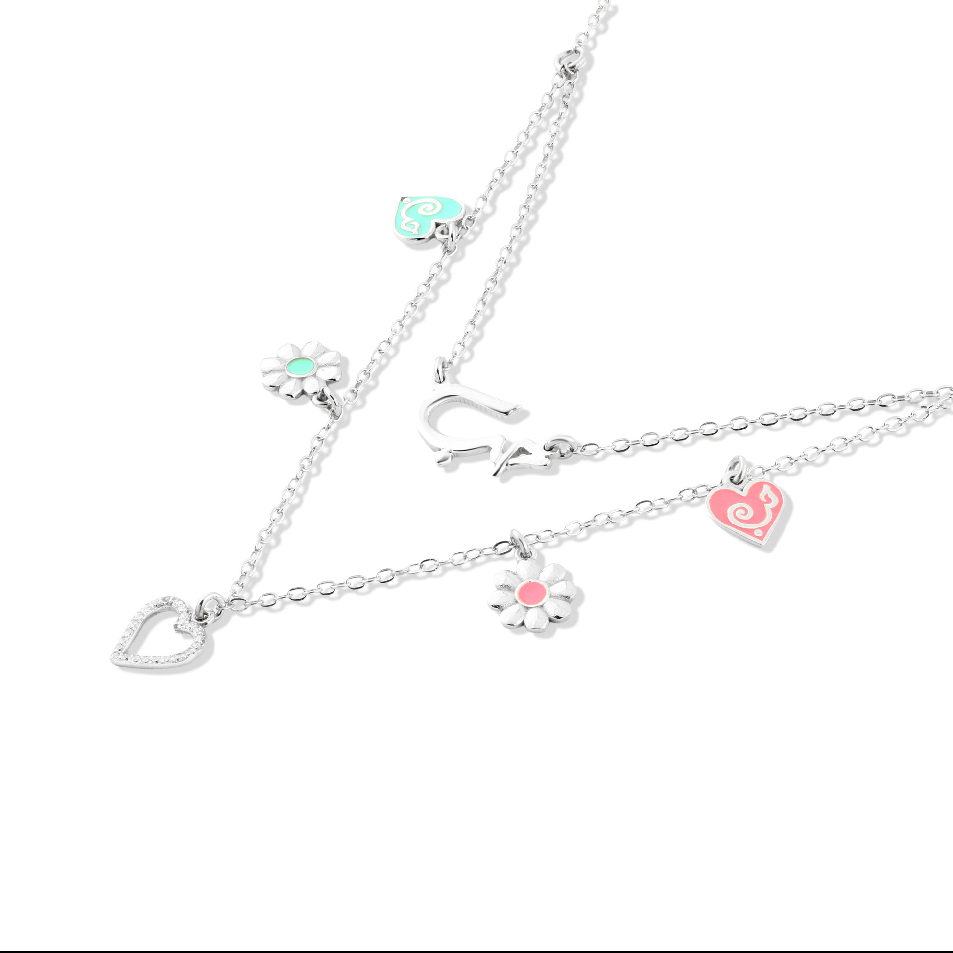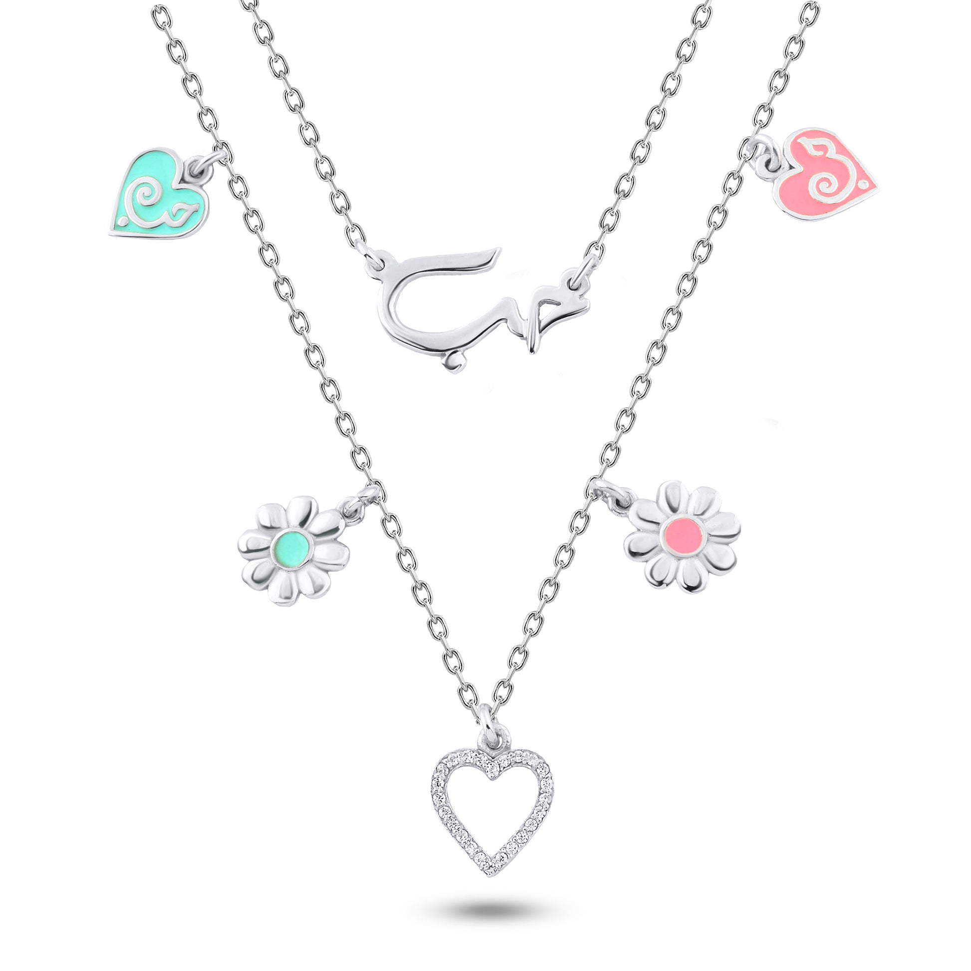 Silver Necklace with “Love” Word, Hearts, and Flowers is a modern piece full of joyful details that reflect a playful and feminine style. Made from 925 silver, it features a layered design that gives a stylish look without the need to stack multiple pieces.