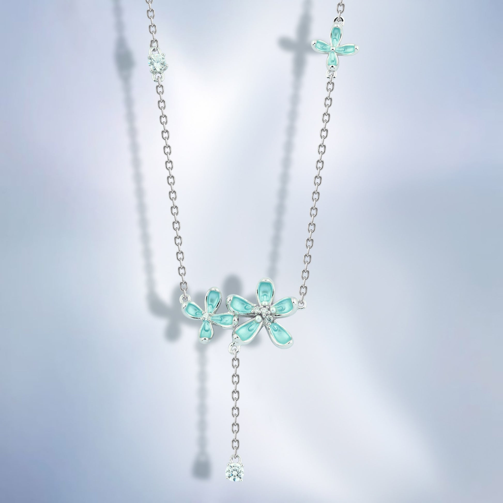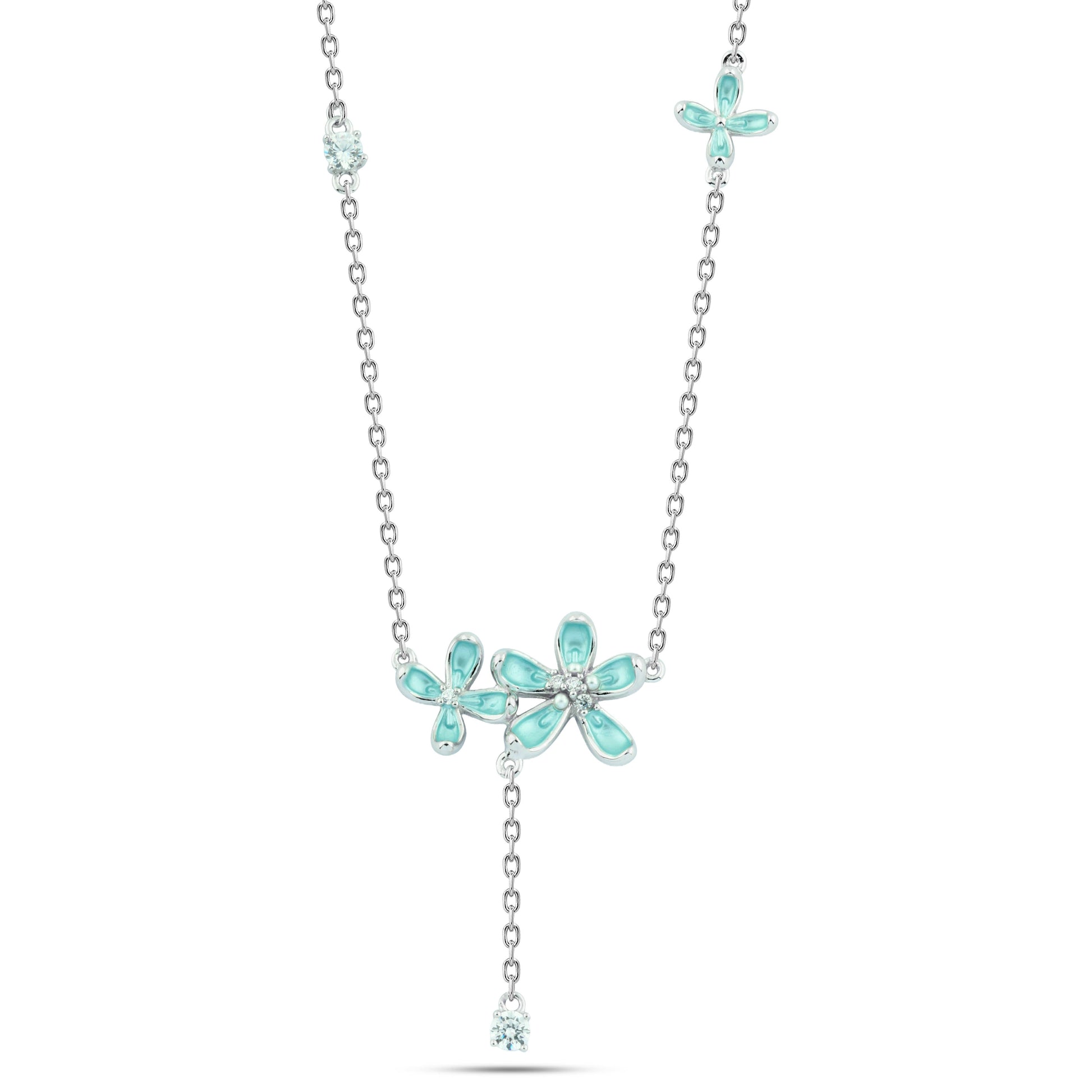 925 Silver Necklace – Dangling Turquoise Flowers with Sparkling Stones
