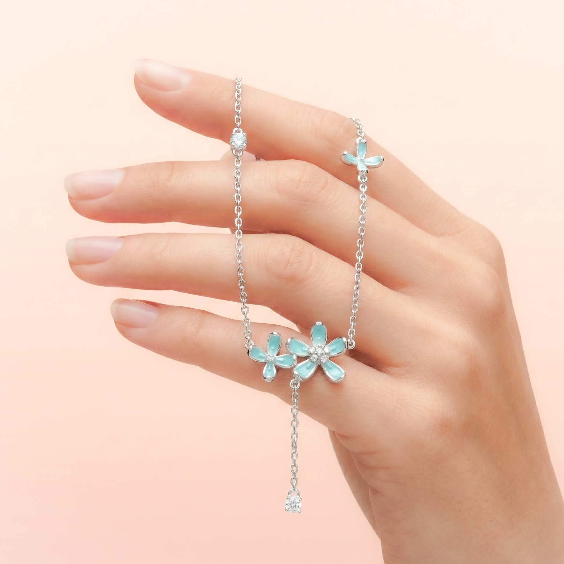 The “Turquoise Floral Drop Necklace” – 925 Silver is a modern feminine piece inspired by the beauty of nature. It features soft turquoise flowers in a refreshing blue-green tone that adds brightness to your look, complemented by a delicate drop chain ending with a sparkling stone for graceful movement and elegant shine.