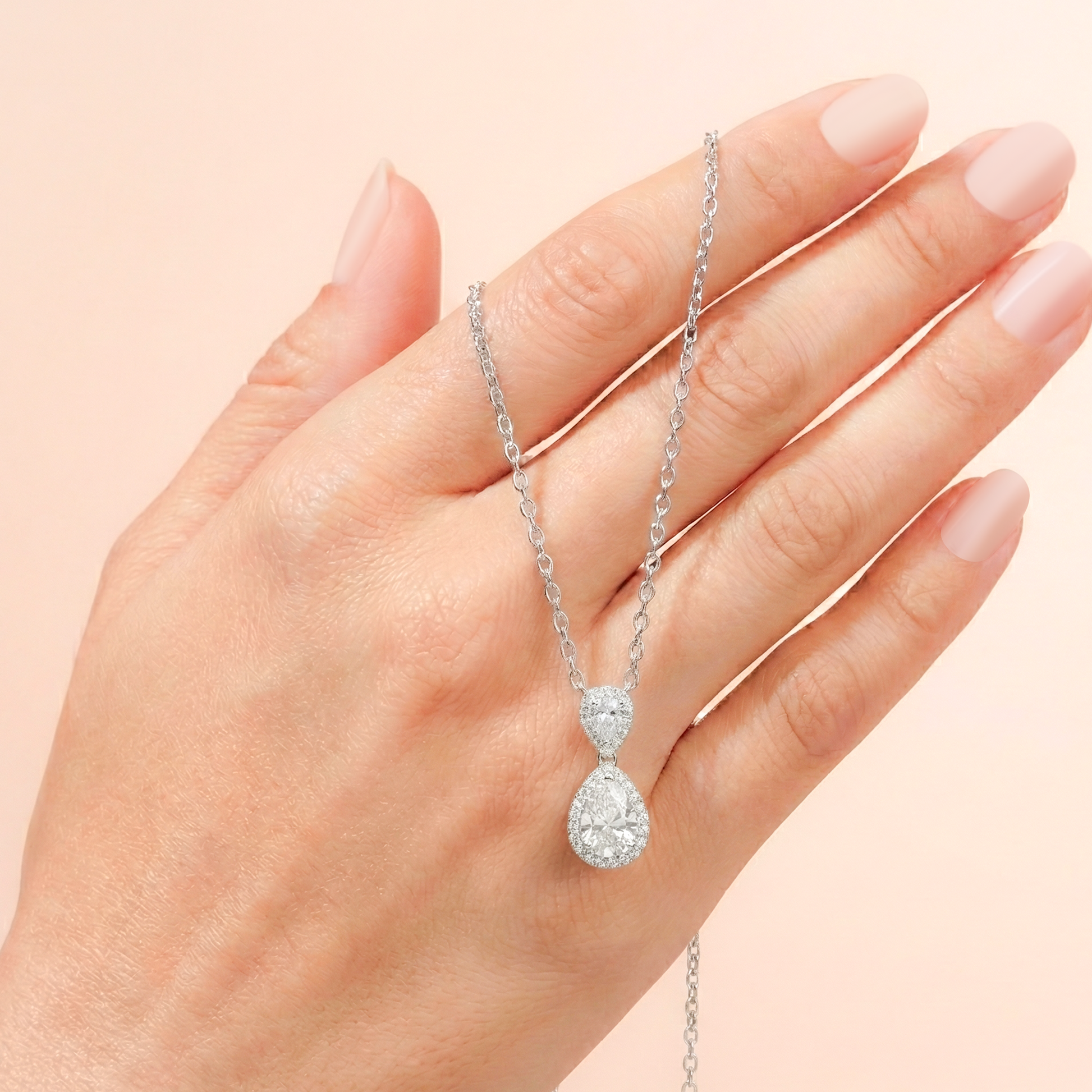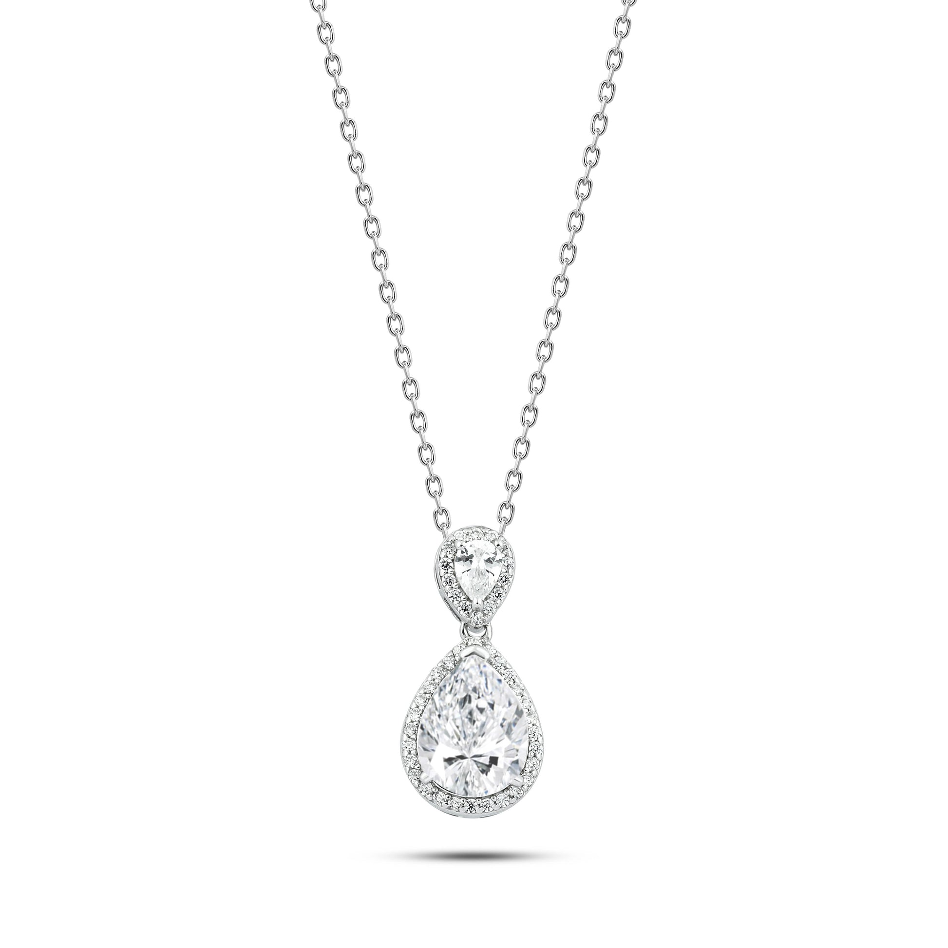 The “Double Teardrop Sparkling Necklace” – 925 Silver is a refined piece that embodies luxury in a classic elegant design. It features a harmonious double teardrop shape centered with a large brilliant stone that captures attention, surrounded by a frame of shimmering stones that enhance its depth and radiance.