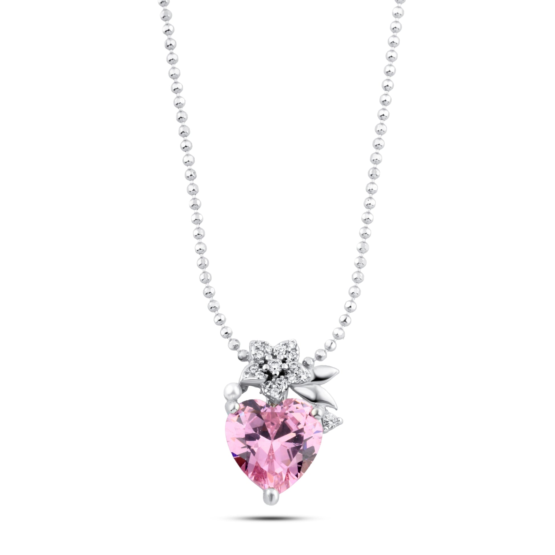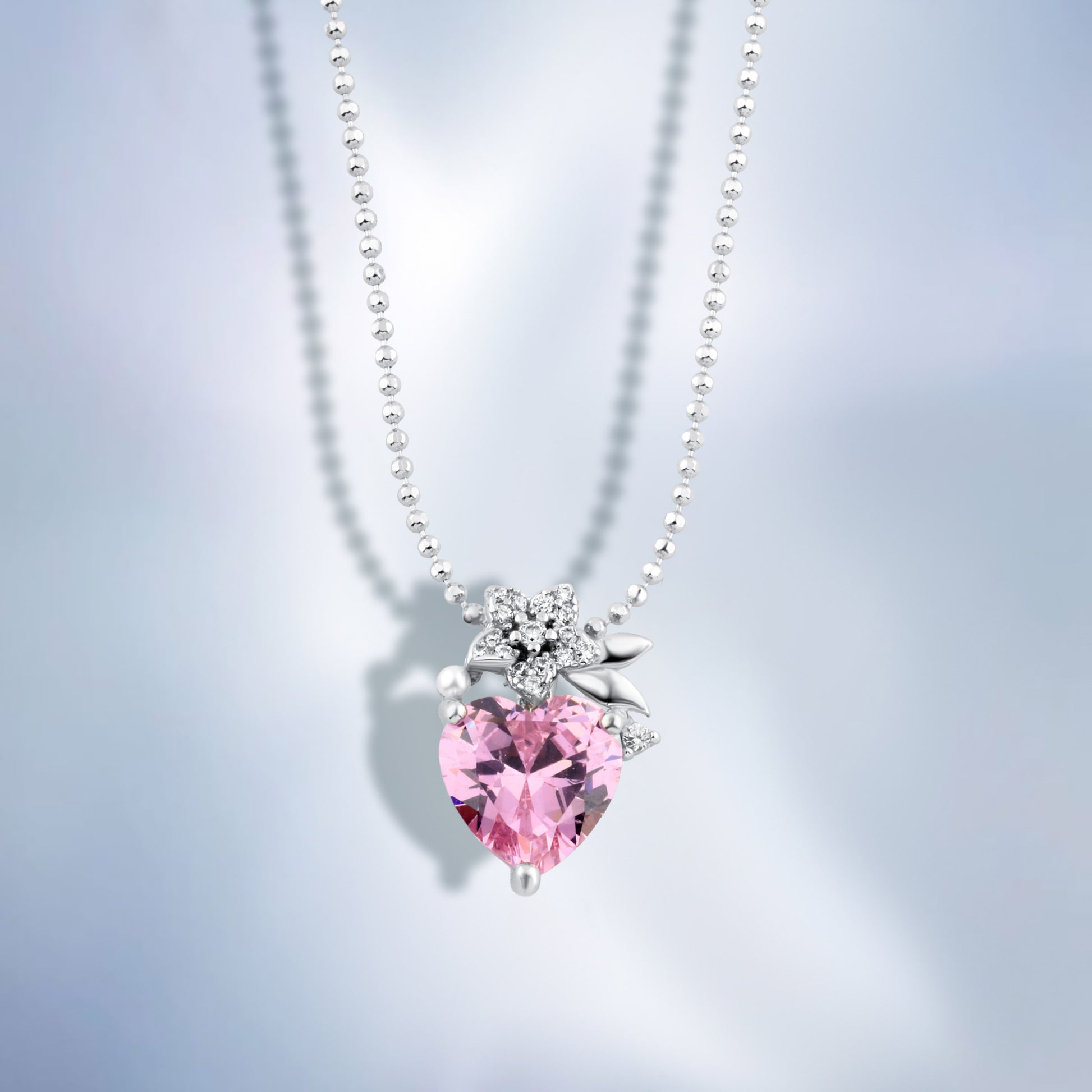 925 Silver Necklace – Pink Heart with Sparkling Flower Design
