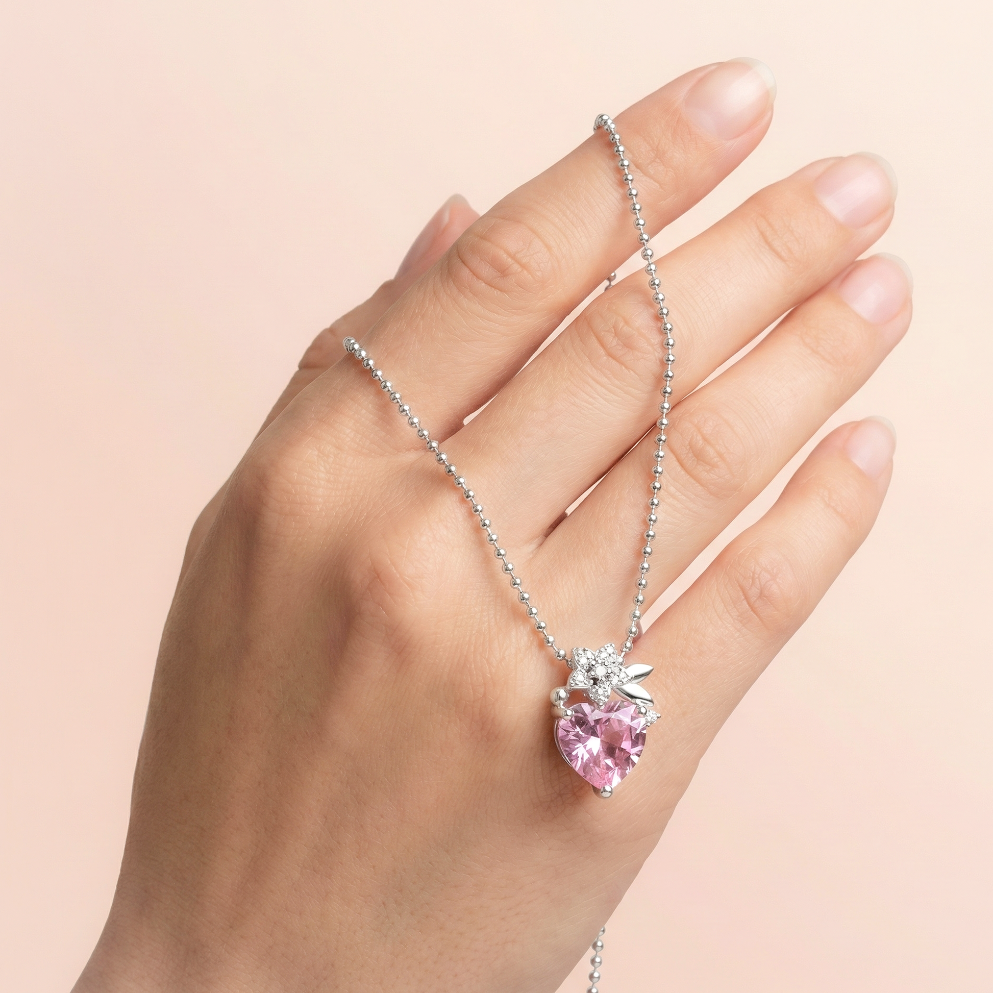 The harmony between the delicate pink tone and the shine of 925 silver gives the necklace an elegant presence suitable for both daily wear and special occasions. Its romantic design makes it a standout accessory that adds warmth and attraction to any look, whether paired with an evening dress or a feminine casual outfit.