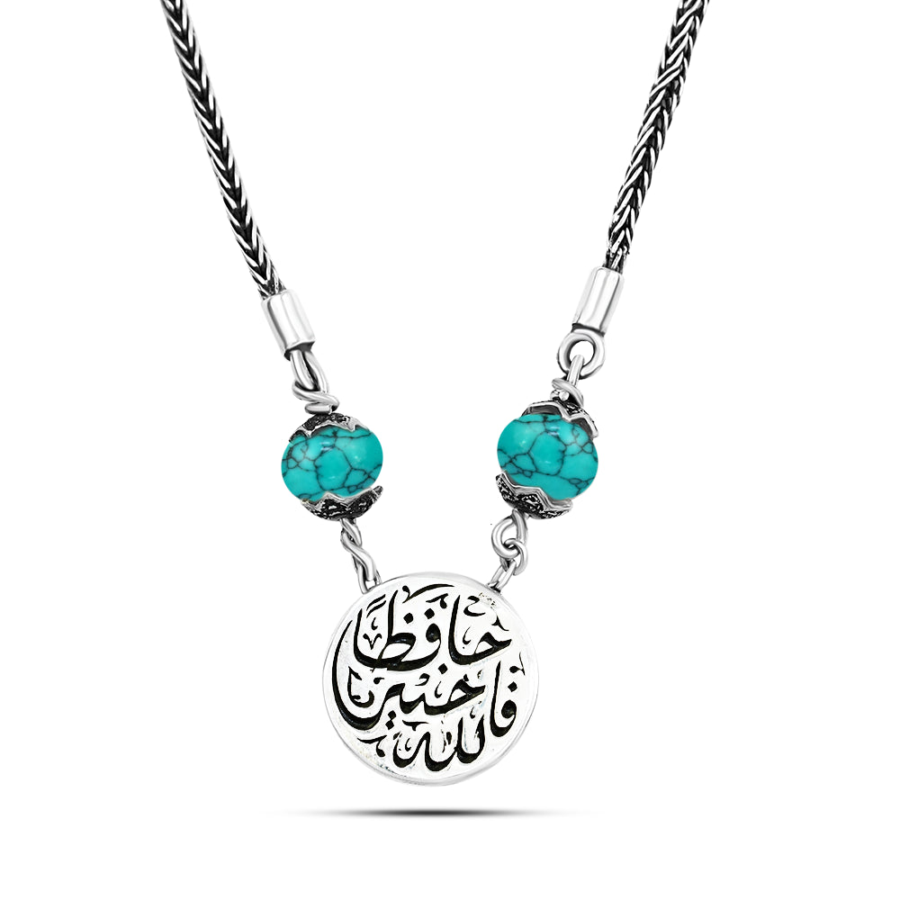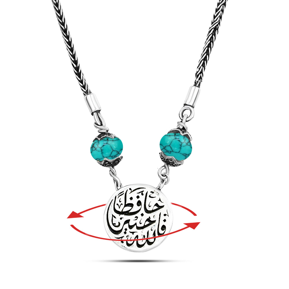 (فالله خير حافظا)(سعاده) عقد فضة مصري حريمي عيار 925 بوجهين, متوج بحجر فيروز