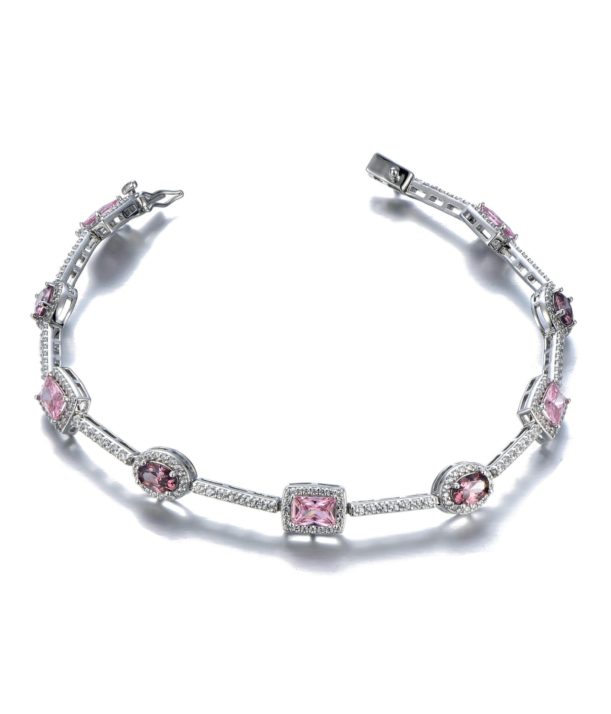 925 sterling silver bracelet plated with platinum for a touch of elegance. It features a captivating design adorned with a collection of stunning pink zircon stones in various shapes, adding a sense of luxury and creativity. The bracelet's delicate frame beautifully reflects light, making it perfect for special occasions or as a stylish addition to everyday looks