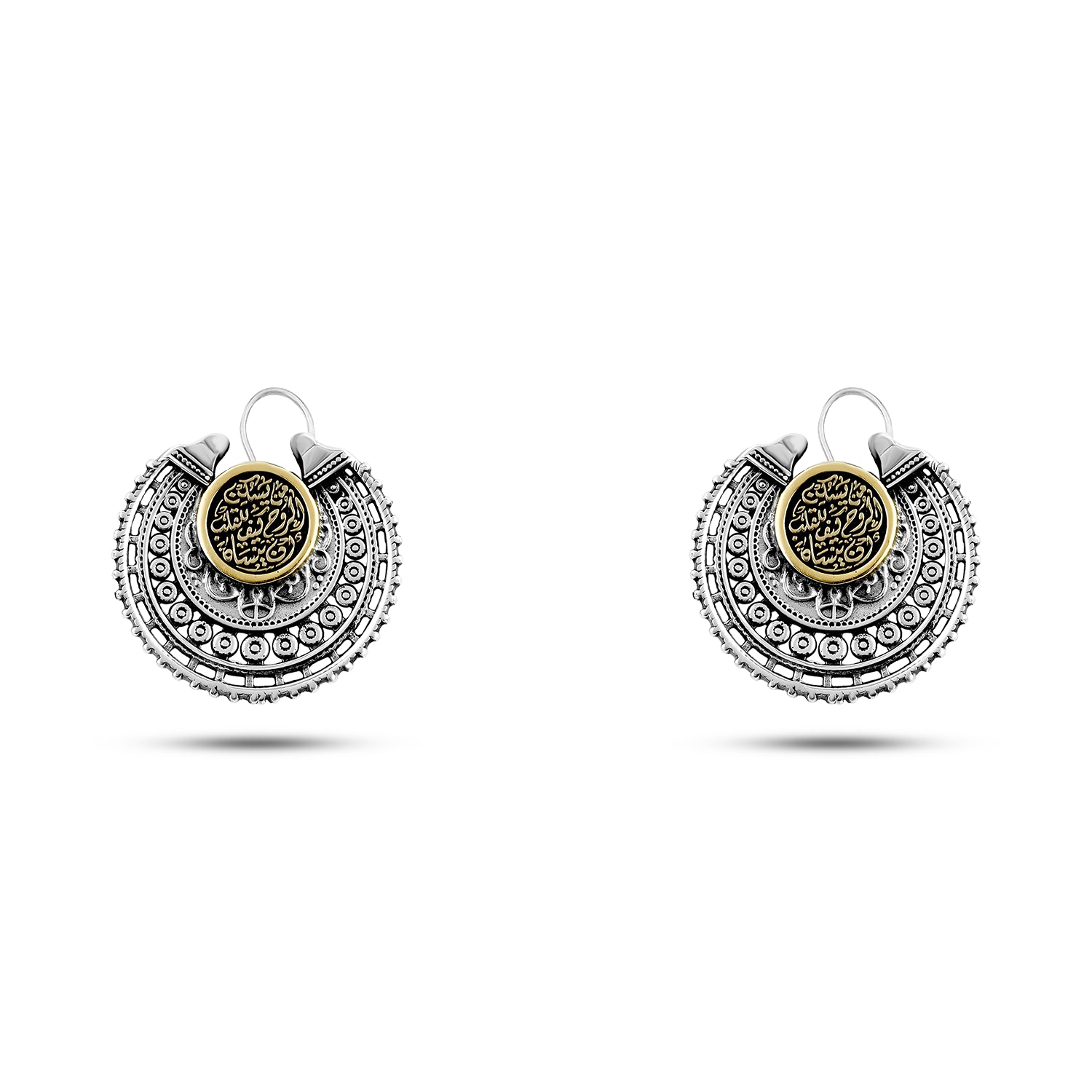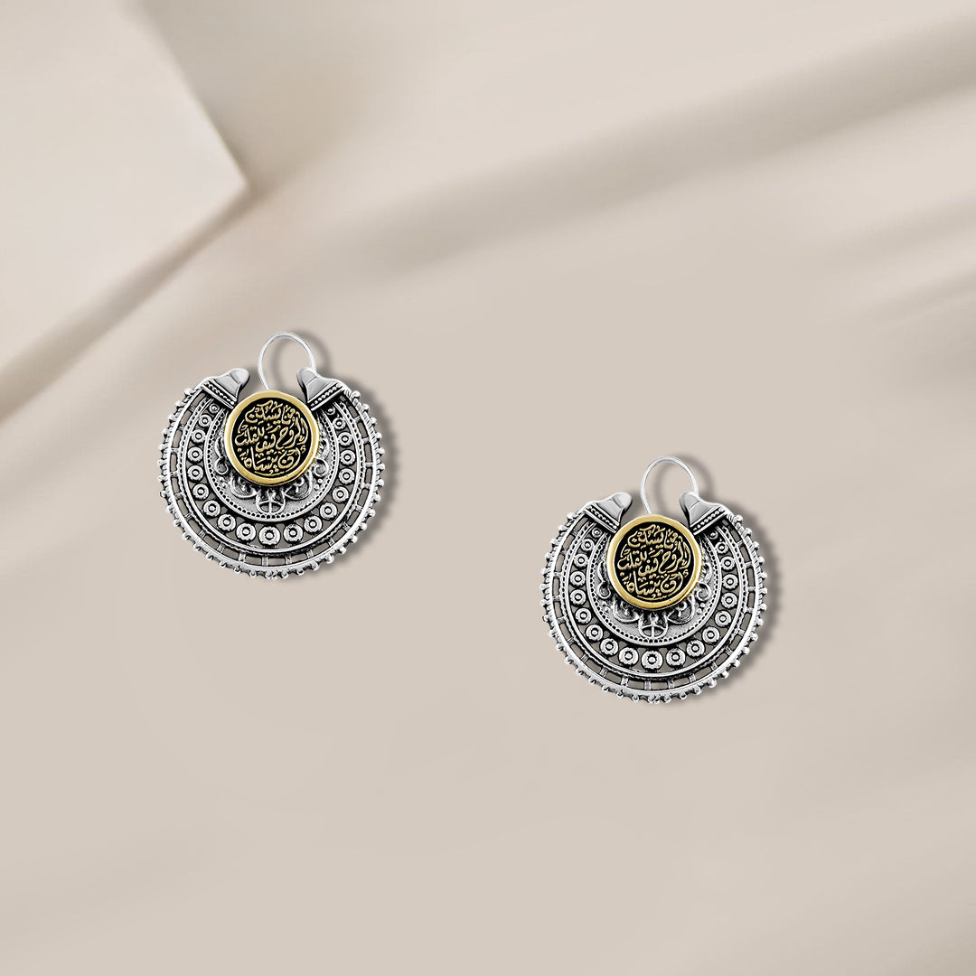 Elegant Arabic-style silver earrings crafted from 925 sterling silver and artistically inlaid with a golden brass centerpiece. The design is highlighted by a delicately engraved verse in authentic Arabic calligraphy: "For Allah is the Best Guardian, and He is the Most Merciful of the merciful." This piece beautifully blends traditional craftsmanship with spiritual symbolism, making it a meaningful gift or a unique personal accessory. The intricate geometric and circular patterns showcase exceptional attention to detail, offering both cultural richness and timeless elegance.