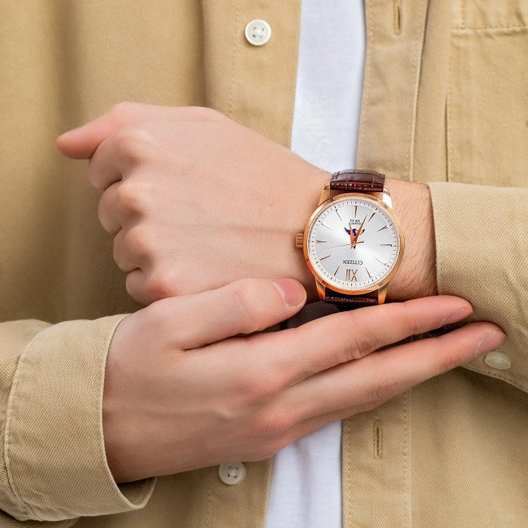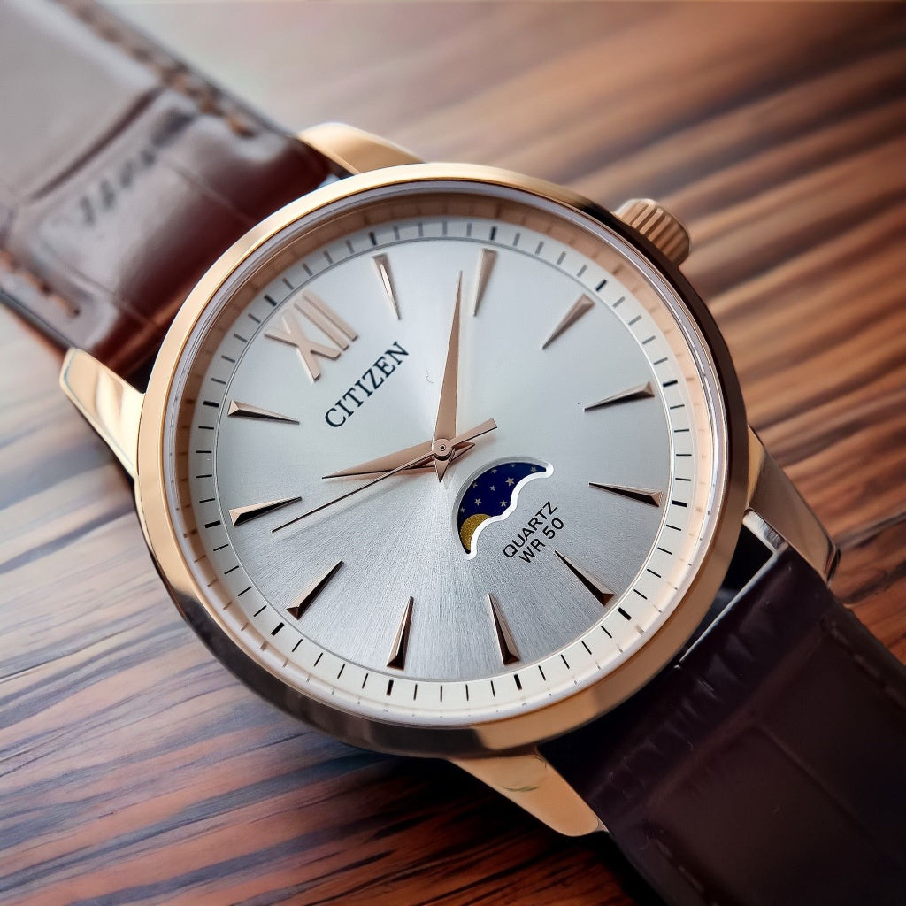 The Citizen AK5003-05A blends classic elegance with modern sophistication, reflecting refined taste for the contemporary gentleman. It features a radiant silver dial with a moonphase display, complemented by rose gold-tone hands and markers that exude luxury. The premium brown leather strap with crocodile texture ensures comfort and timeless style. Powered by a precise Japanese quartz movement and offering water resistance up to 50 meters, this watch is perfect for both daily wear and formal occasions. A true symbol of class and distinction in every detail.