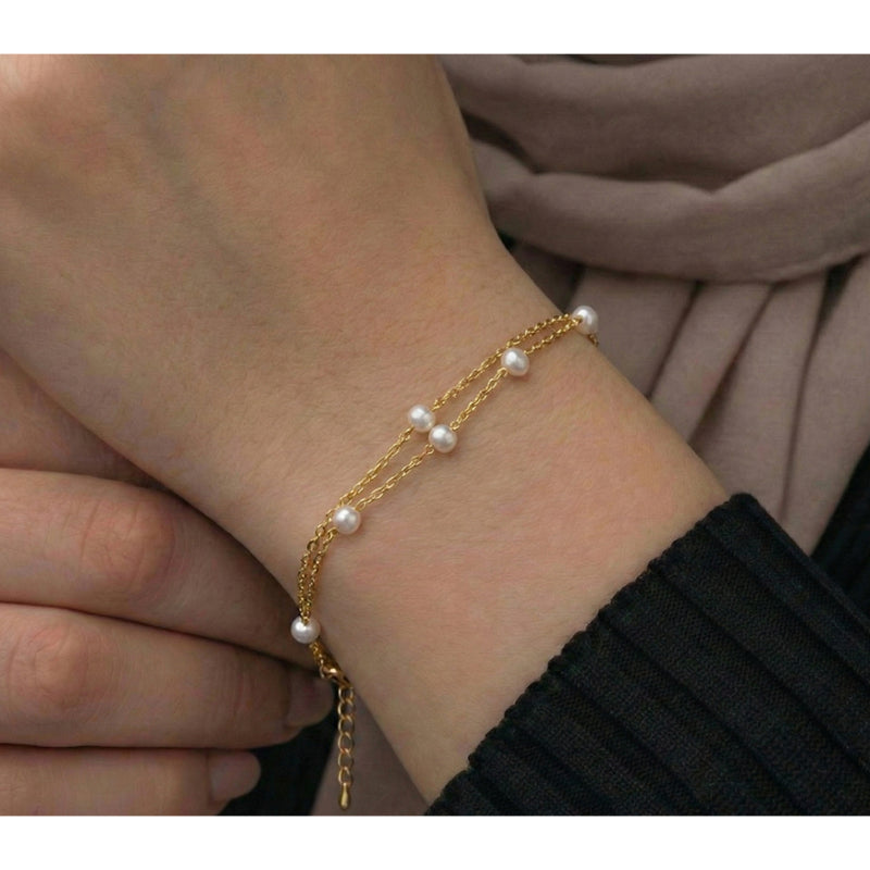 Classic 925 Silver Pearl Bracelet with Double Chain Design