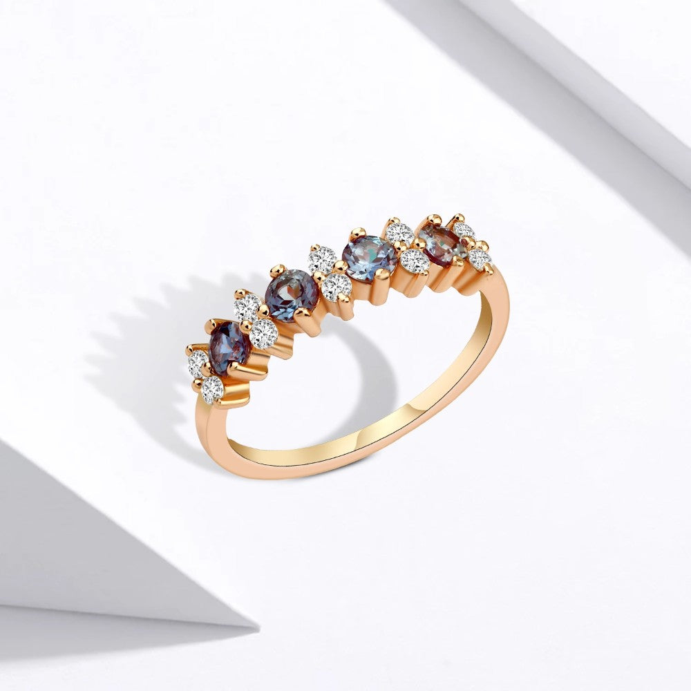 A luxurious ring crafted from 925 sterling silver and plated in elegant rose gold, adorned with rare Alexandrite stones that shift color under different lighting, adding a magical touch to the design. The central gems are beautifully framed by sparkling zircon stones, creating a perfect harmony of brilliance and sophistication in one exquisite piece.