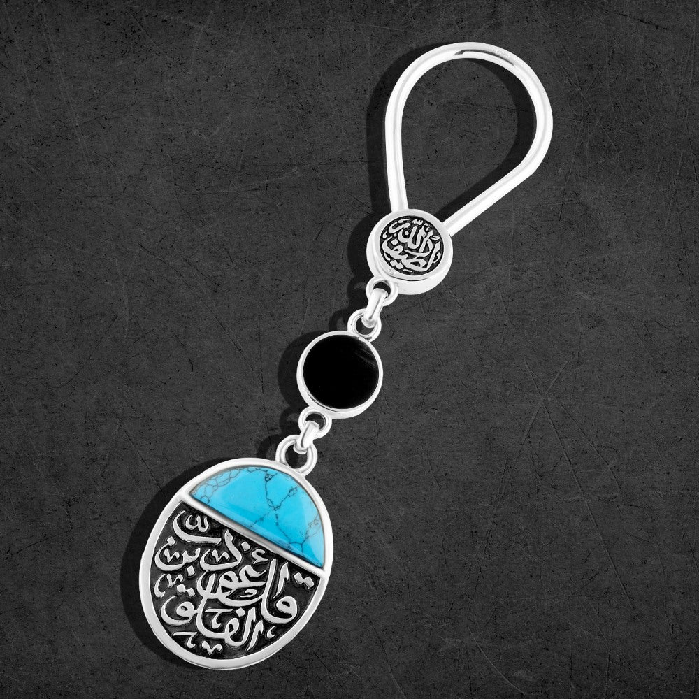 ميدالية مفاتيح فضة مصرية بتصميم إسلامي فاخر ووجهان فريدين. الوجه الأول محفور عليه “فالله خير حافظا” بالخط العربي الأصيل، ويعلوه حجر من العقيق، مما يضيف لمسة روحانية وجمالية. الوجه الثاني محفور عليه “قل أعوذ برب الفلق” بالخط العربي، ويزينه حجر من الفيروز الذي يعكس لوناً هادئاً وجميلاً. الميدالية مصنوعة من الفضة المصرية العالية الجودة، وتجمع بين التصميم الديني واللمسات الفاخرة التي تجعلها هدية مثالية