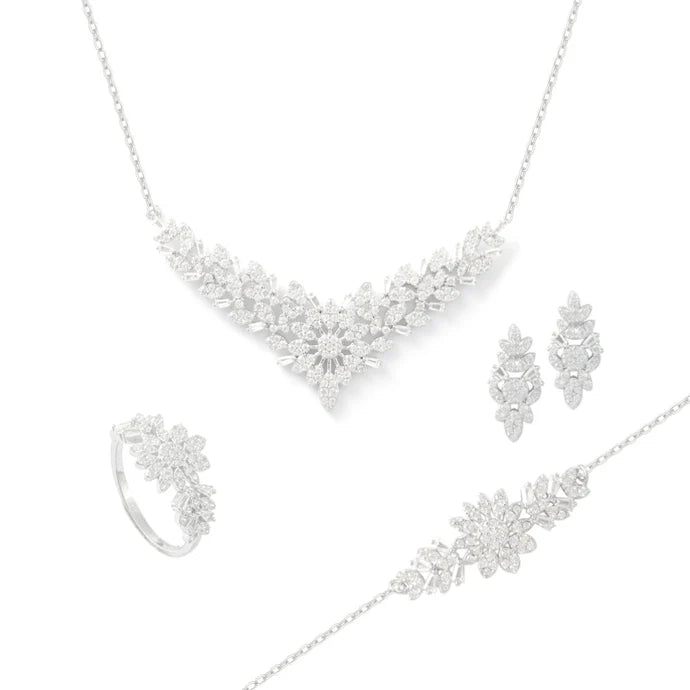 The necklace boasts a wide and central design combining floral shapes with rectangular and oval zircon stones, while the ring and bracelet follow the same intertwined geometric style.
