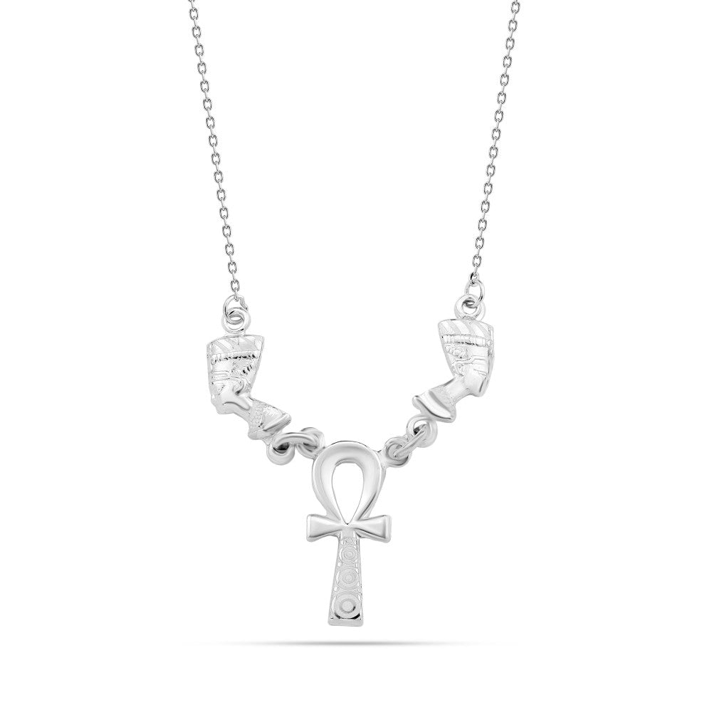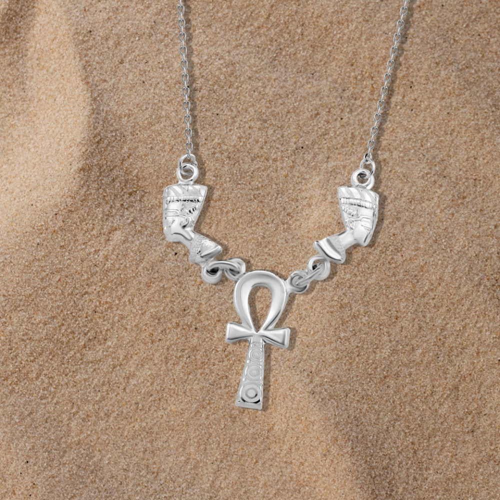 A 925 silver necklace that blends historical symbolism with modern beauty through a unique design featuring the Ankh (Key of Life) and Queen Nefertiti. The chain is crafted from pure silver with a captivating shine, and intricate details enhance the necklace's allure. The Key of Life, a symbol of immortality and power in ancient Egyptian civilization, is designed with refined craftsmanship and striking details, while the statue of Queen Nefertiti, symbolizing femininity and royal beauty, is meticulously engraved to showcase her elegance.