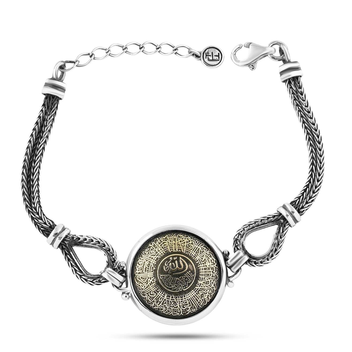 This elegant Arabic bracelet is crafted from pure 925 sterling silver, inlaid with golden brass and finished with an oxidized touch for a vintage feel. The centerpiece showcases a beautifully engraved Ayat Al-Kursi, offering both spiritual depth and artistic charm. The adjustable chain ensures a comfortable fit for any wrist, making it an ideal gift for those who appreciate meaningful design and timeless elegance.