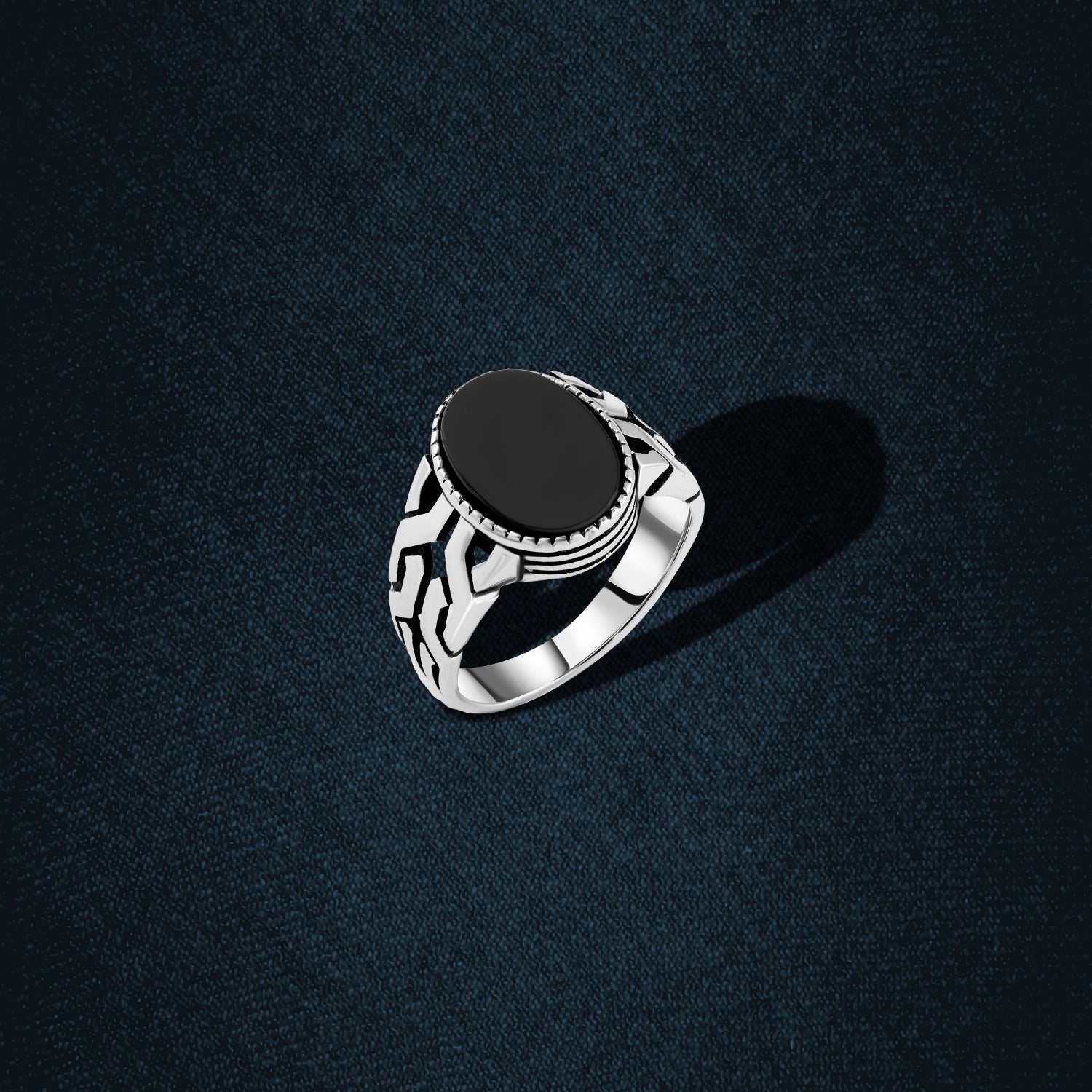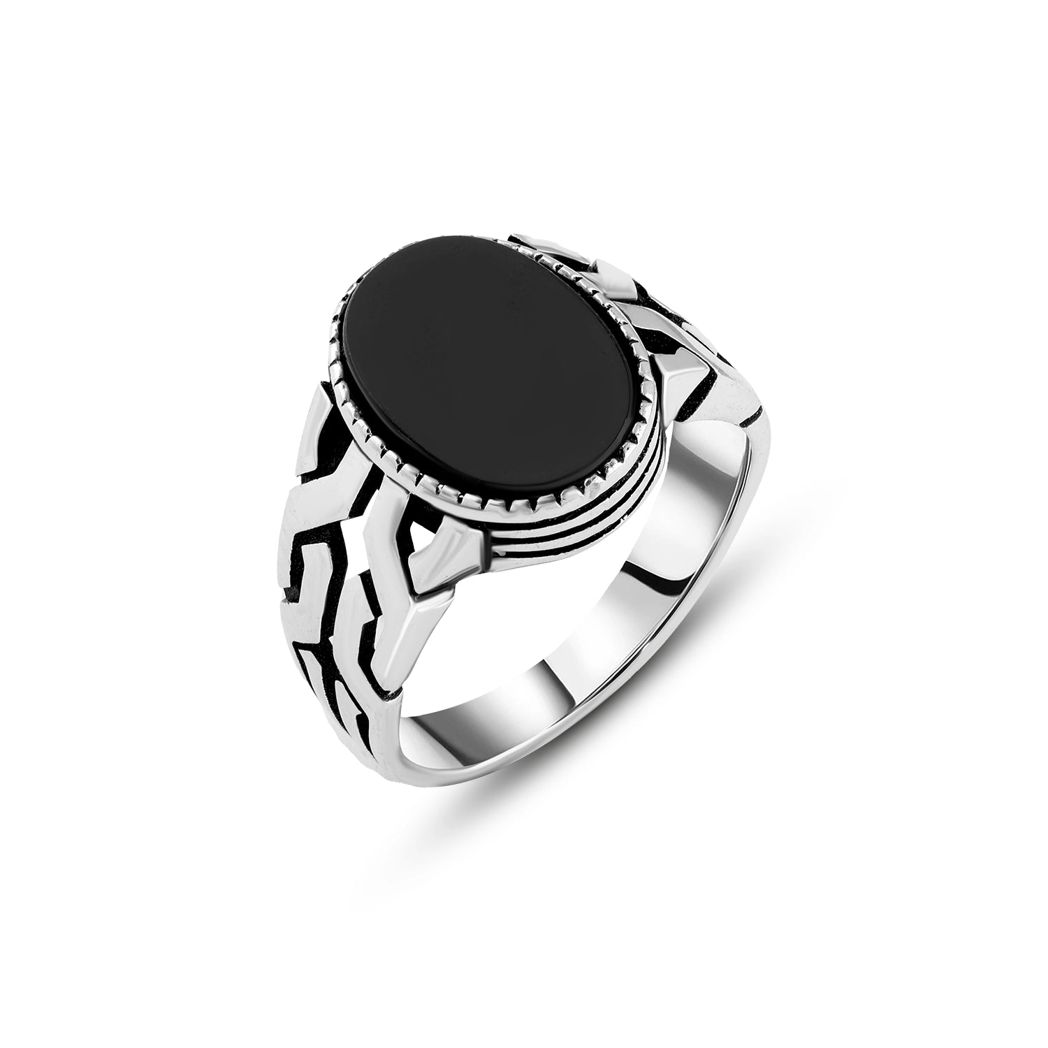 An elegant men’s ring crafted from polished silver, featuring a natural black onyx stone in an oval shape, framed with a finely notched bezel that adds a strong, classic edge. The sides are engraved with bold geometric patterns over an oxidized background, giving the piece a modern, confident character. With sharp detailing and a refined finish, this ring is perfect for men who appreciate bold style and timeless sophistication—day or night.