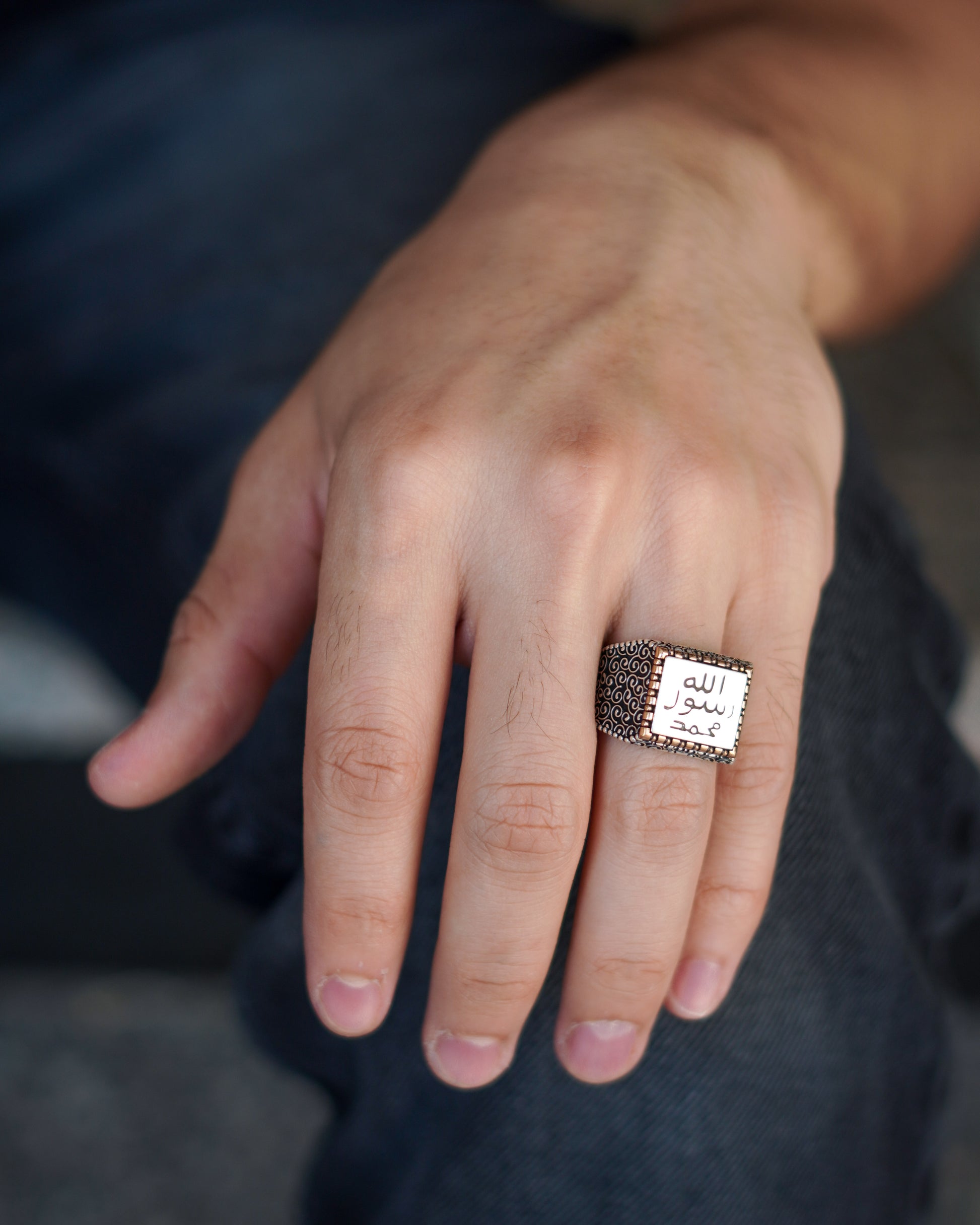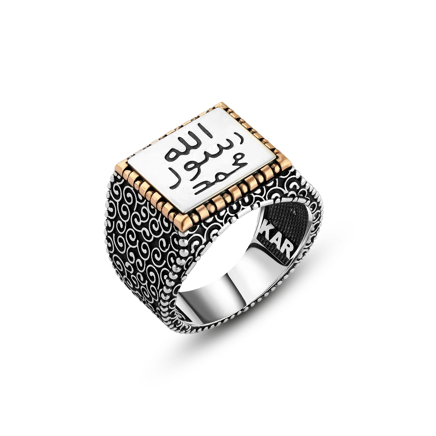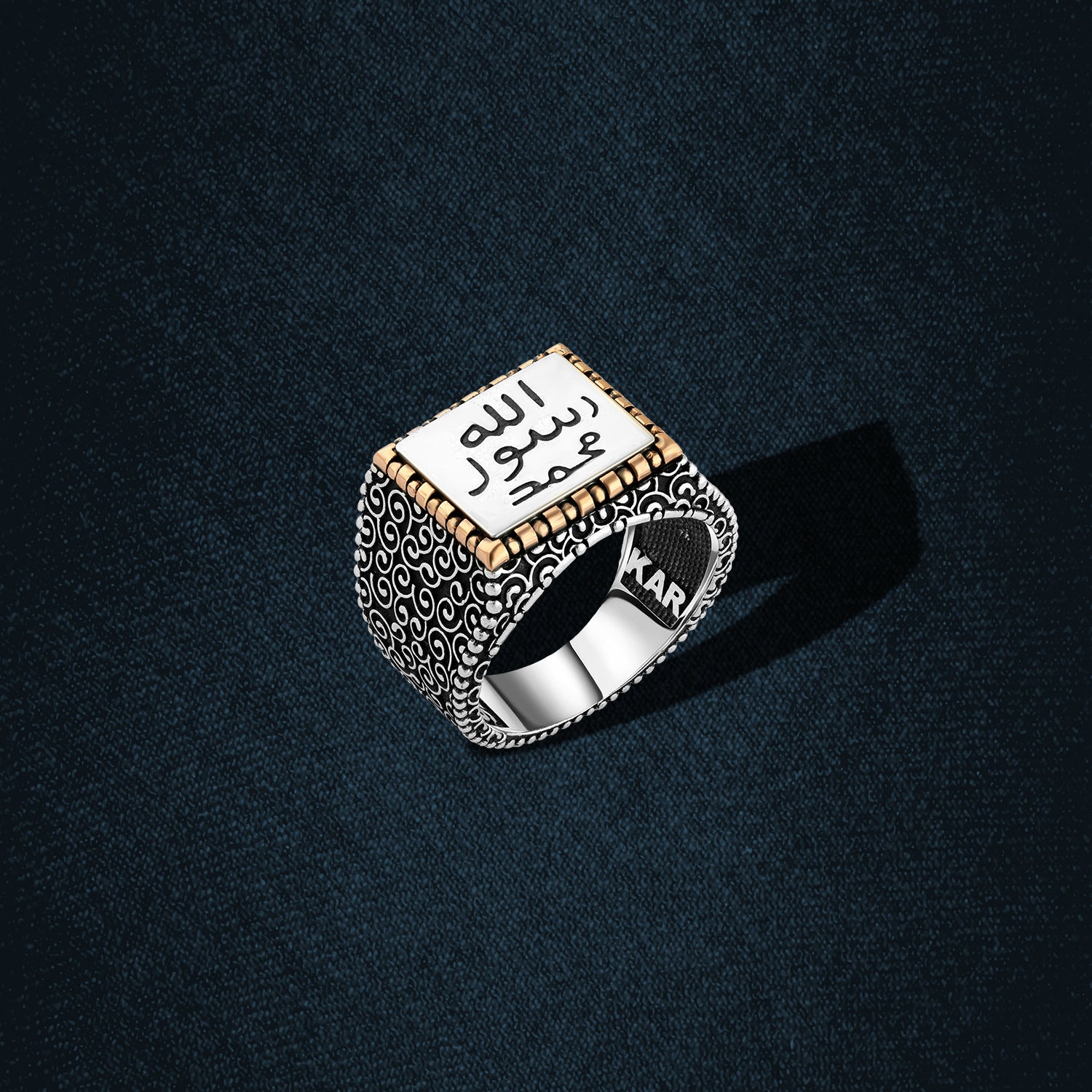 A luxurious men’s ring crafted from sterling silver, featuring a rectangular-cut natural white agate stone engraved with the phrase "Allah - Rasul - Muhammad" in elegant Arabic calligraphy. The stone is framed by a golden-toned copper beaded border that enhances the design with warmth and refinement. The sides of the ring are intricately decorated with spiral motifs over a black oxidized background, offering rich contrast and cultural detail. A powerful piece that symbolizes faith, identity, and timeless craftsmanship.