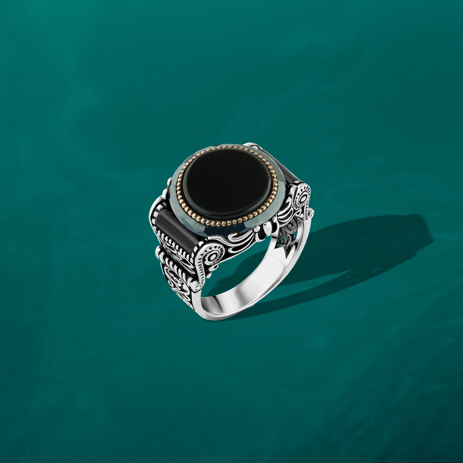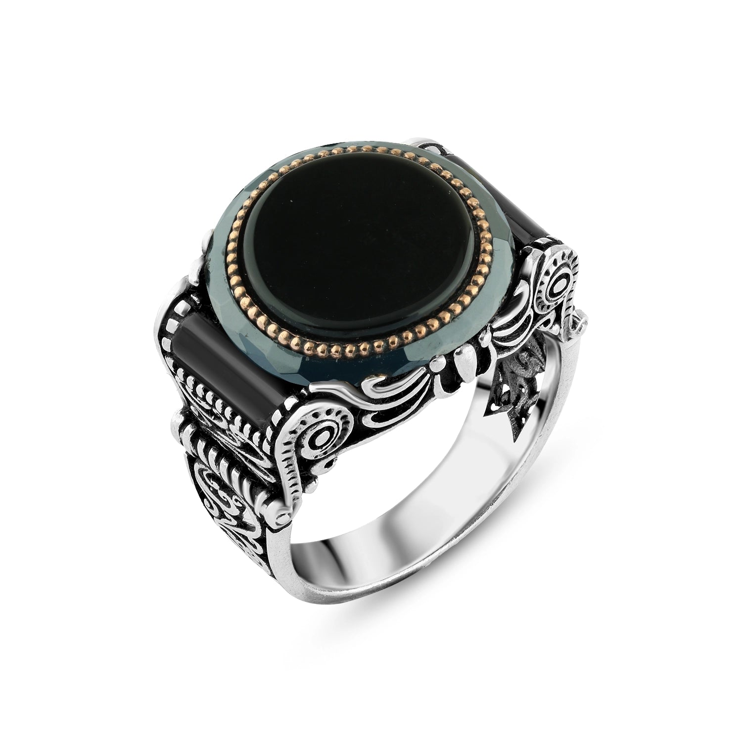 Men's Silver Ring with Black Round Stone and Oriental Details