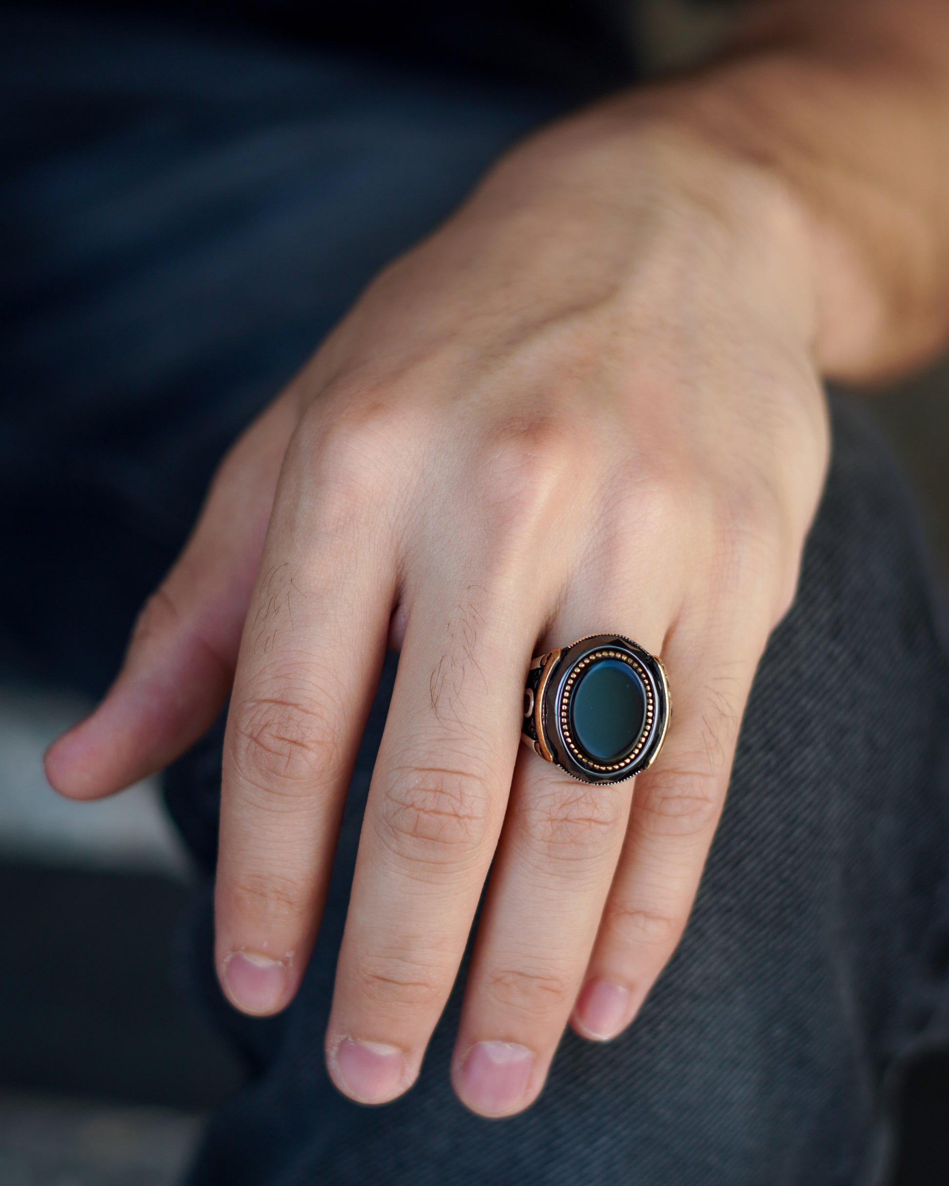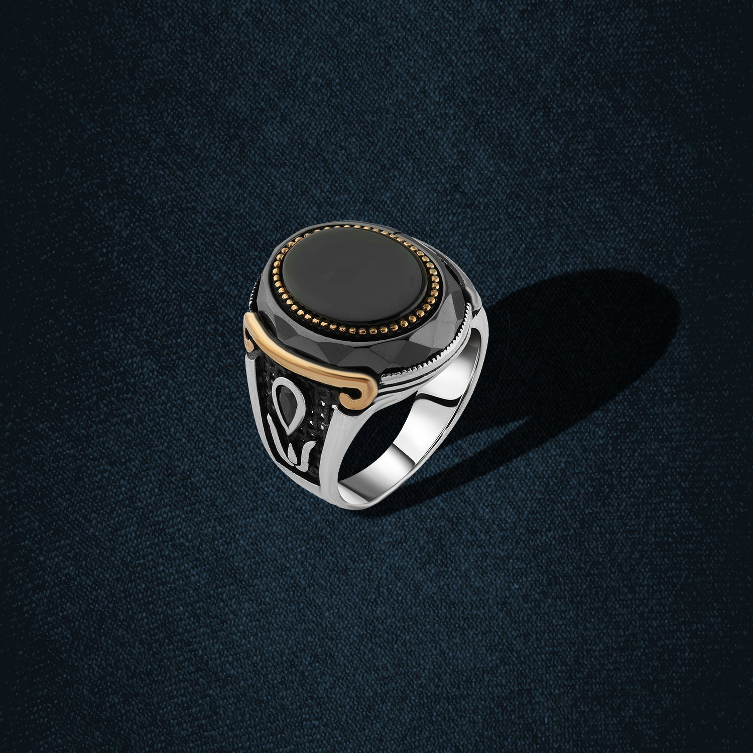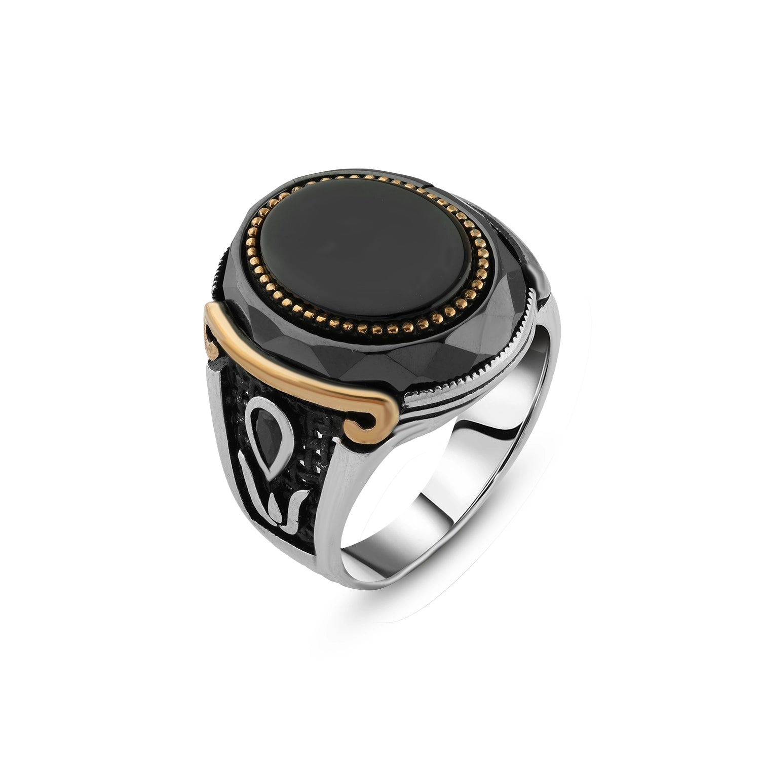 A luxurious men's ring crafted from silver and adorned with a natural black onyx stone in a polished circular cut. The centerpiece is framed by intricate gold-toned detailing, giving the ring a regal and distinguished look. The sides feature engraved artistic motifs that add an authentic oriental flair. A perfect balance of elegance and strength, suitable for both formal and everyday wear.