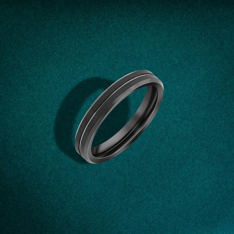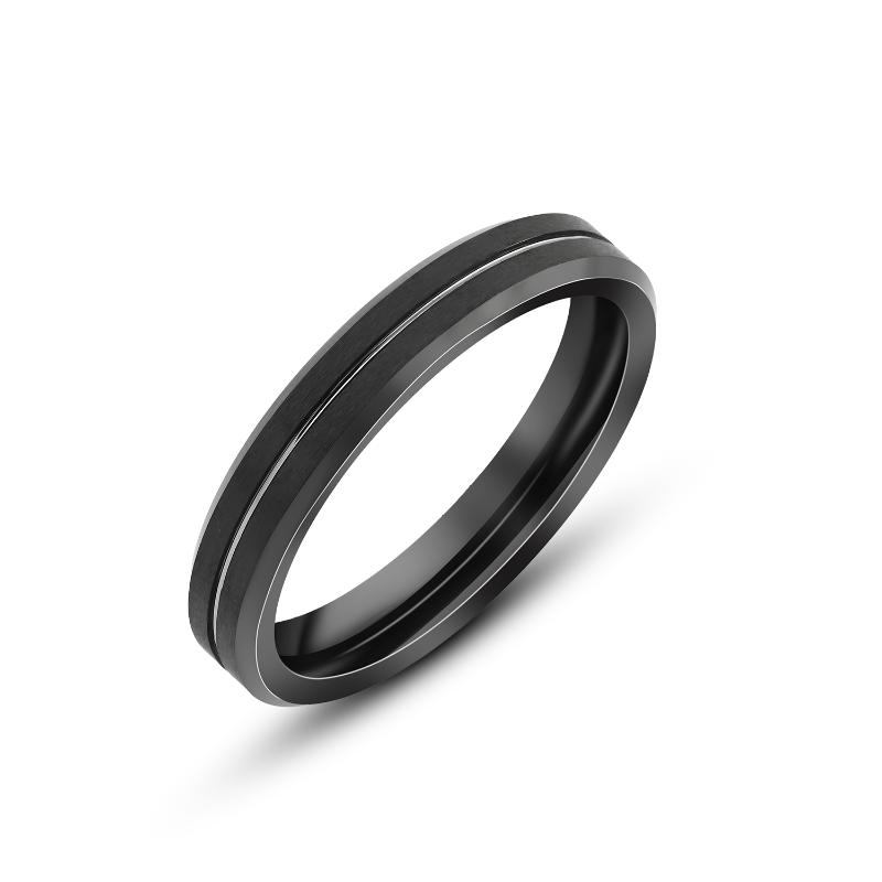 This men's tungsten ring features a simple, modern design, featuring a distinctive black color with skillfully carved edges. Its beauty is further enhanced by two shiny metal bands on the sides, creating a dramatic contrast with the black color.