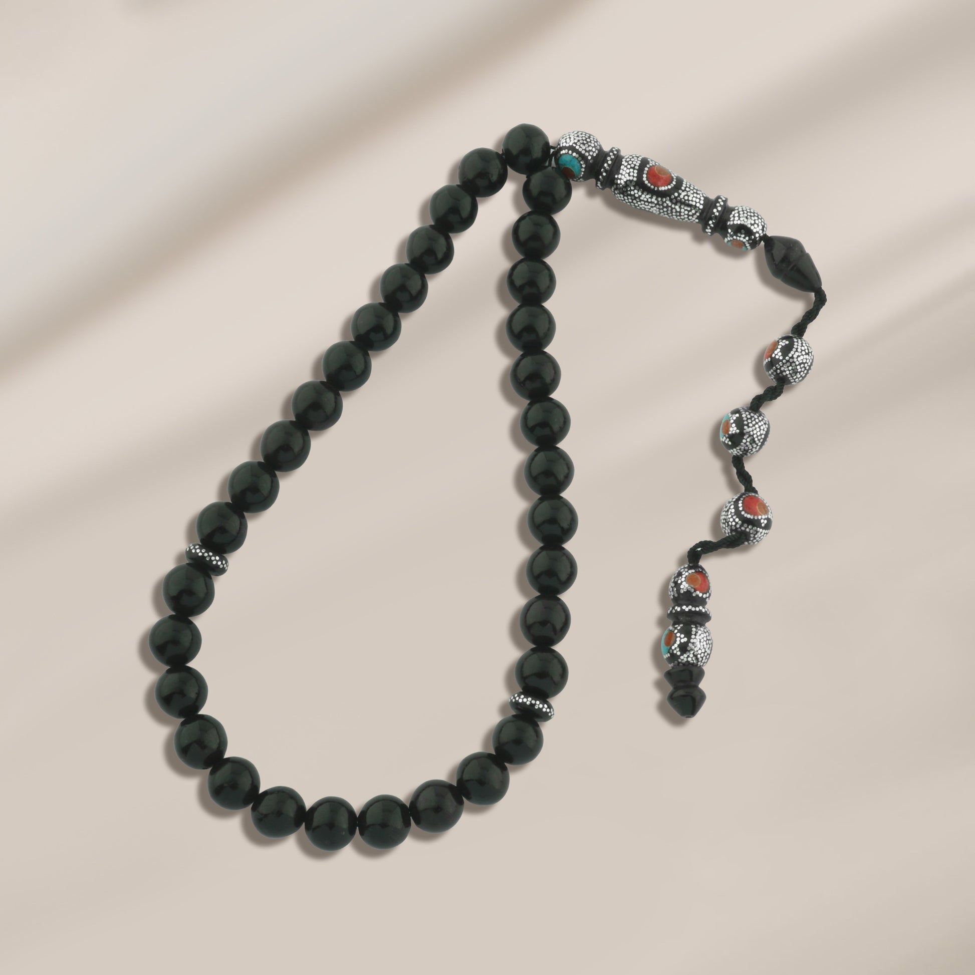 Accented with a pure 999 silver set and enriched with touches of amber and turquoise stones, the prayer beads gain distinctive color contrast and luxurious character. This refined combination blends spiritual significance with elegant craftsmanship.