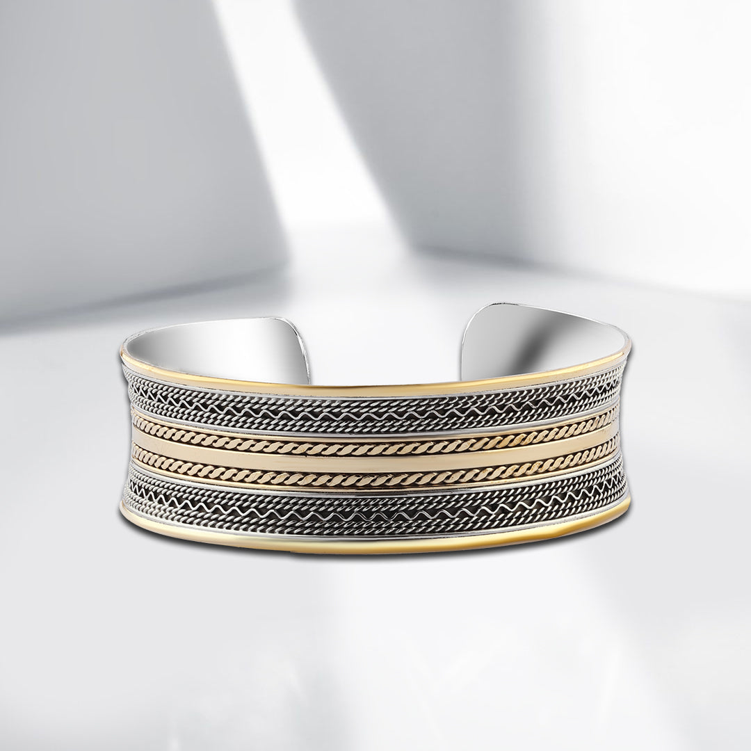 An open silver Bangle inspired by traditional Eastern artistry, featuring intricate double copper lines running through a textured oxidized surface. The detailed craftsmanship and contrasting tones blend heritage with elegance. Polished edges provide a refined finish, while the open-back design ensures easy wear and comfortable fit.
