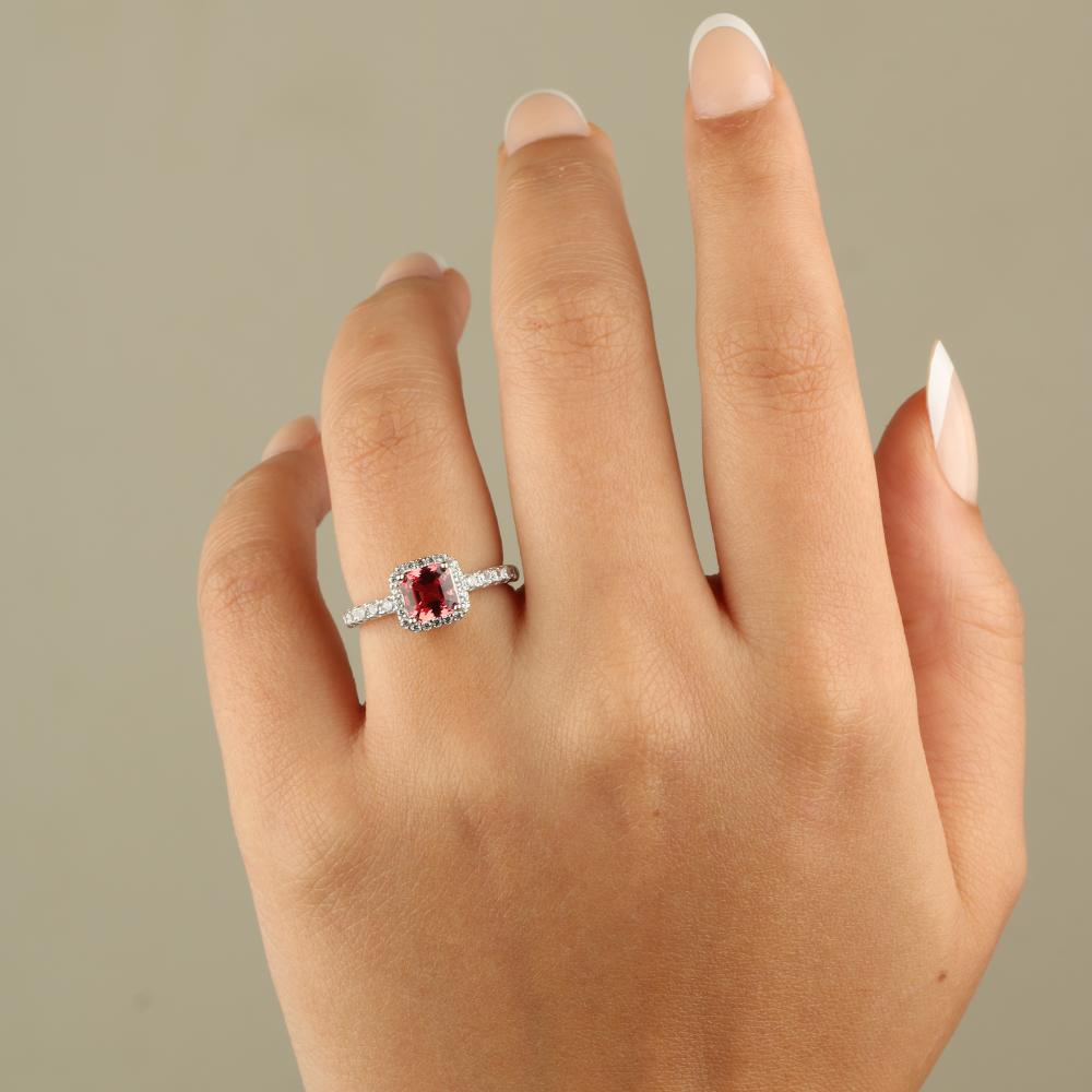 A luxurious 925 sterling silver ring that exudes elegance and sophistication. It showcases a striking princess-cut red zircon at the center, symbolizing passion and strength, beautifully framed by a halo of brilliant white zircon stones for added sparkle. The band is further adorned with delicate white accents that enhance the brilliance of the design. Crafted from high-quality 925 sterling silver, this ring ensures durability and long-lasting shine, making it an ideal choice for both daily wear and special occasions. It also makes a meaningful gift, reflecting refined taste and timeless elegance.