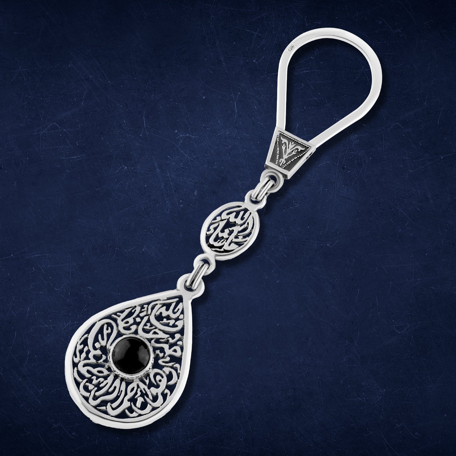 Silver keychain engraved with the words “Verily, in the remembrance of Allah do hearts find peace – O Opener of Doors – Masha’Allah”
