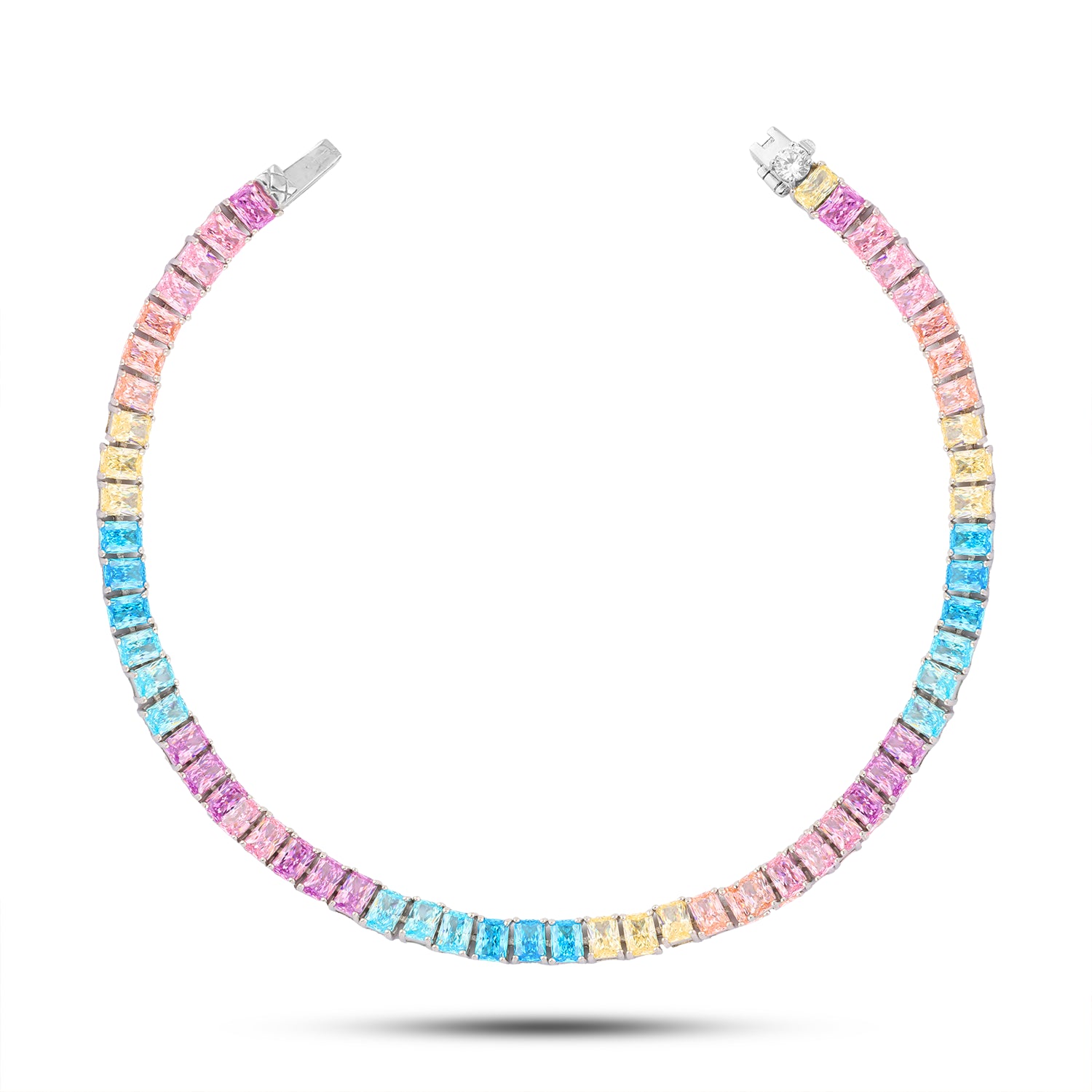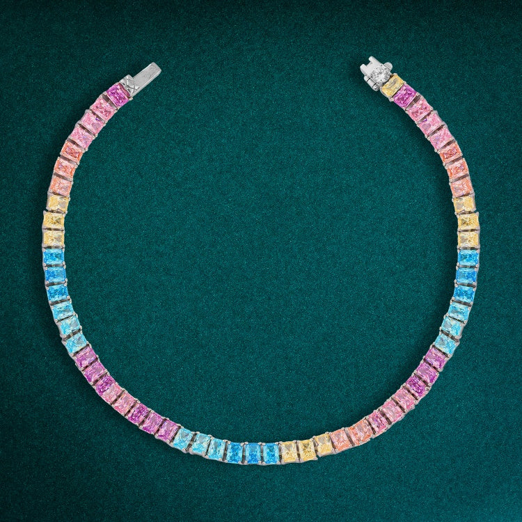أضيفي لمسة من البهجة والفخامة إلى إطلالتك مع انسيال بتصميم راقٍ من الفضة عيار 925 المرصّع بأحجار زركون ملوّنة تنبض بالحيوية والجمال.
