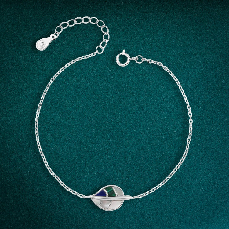 يتوسط الانسيال تعليقة على شكل ورقة شجر أنيقة بتفاصيل دقيقة تنبض بالحياة، حيث تتداخل تدرجات الأزرق والأخضر مع لمسة بيضاء صدفية تمنحه بريقًا فريدًا يعكس صفاء الطبيعة وسحرها.