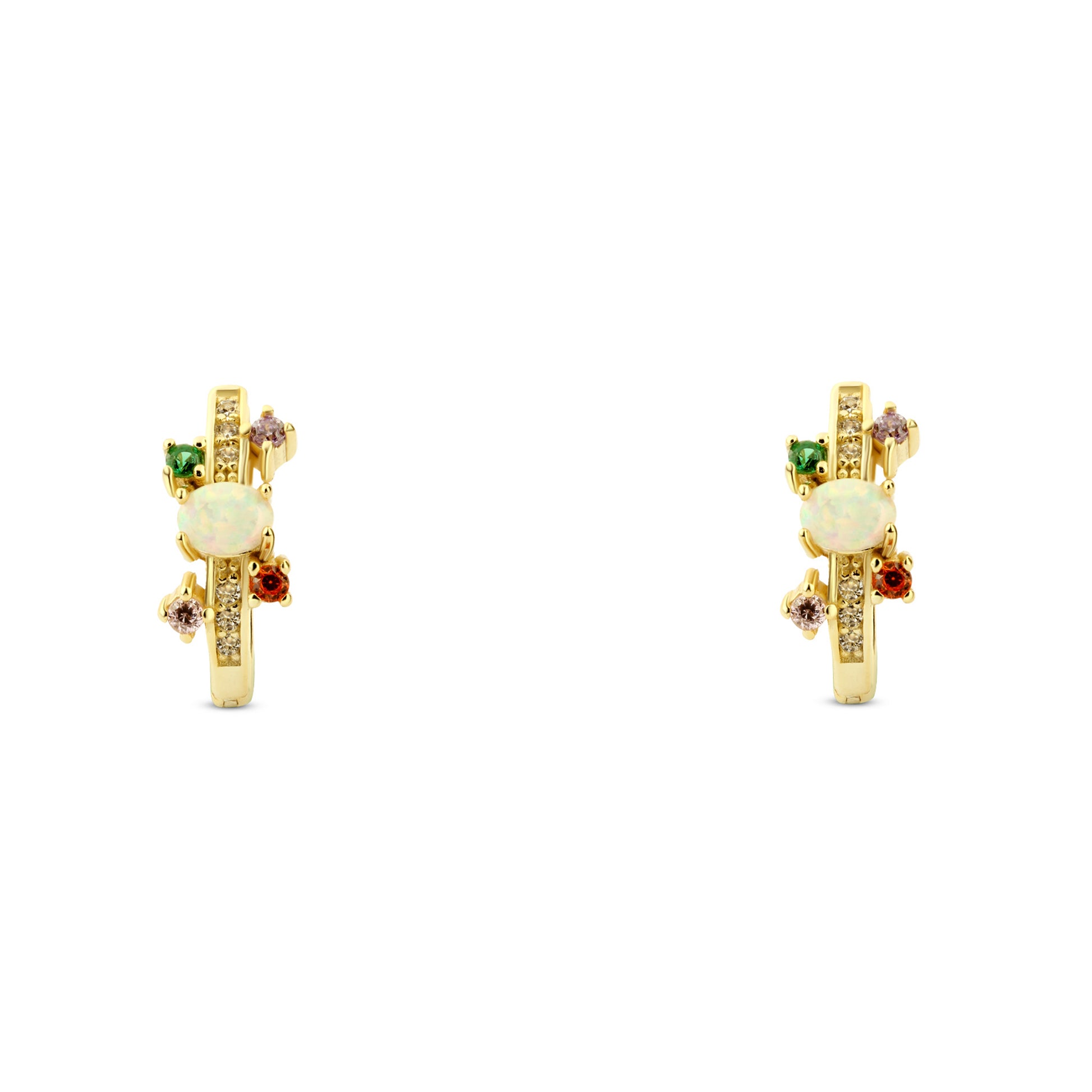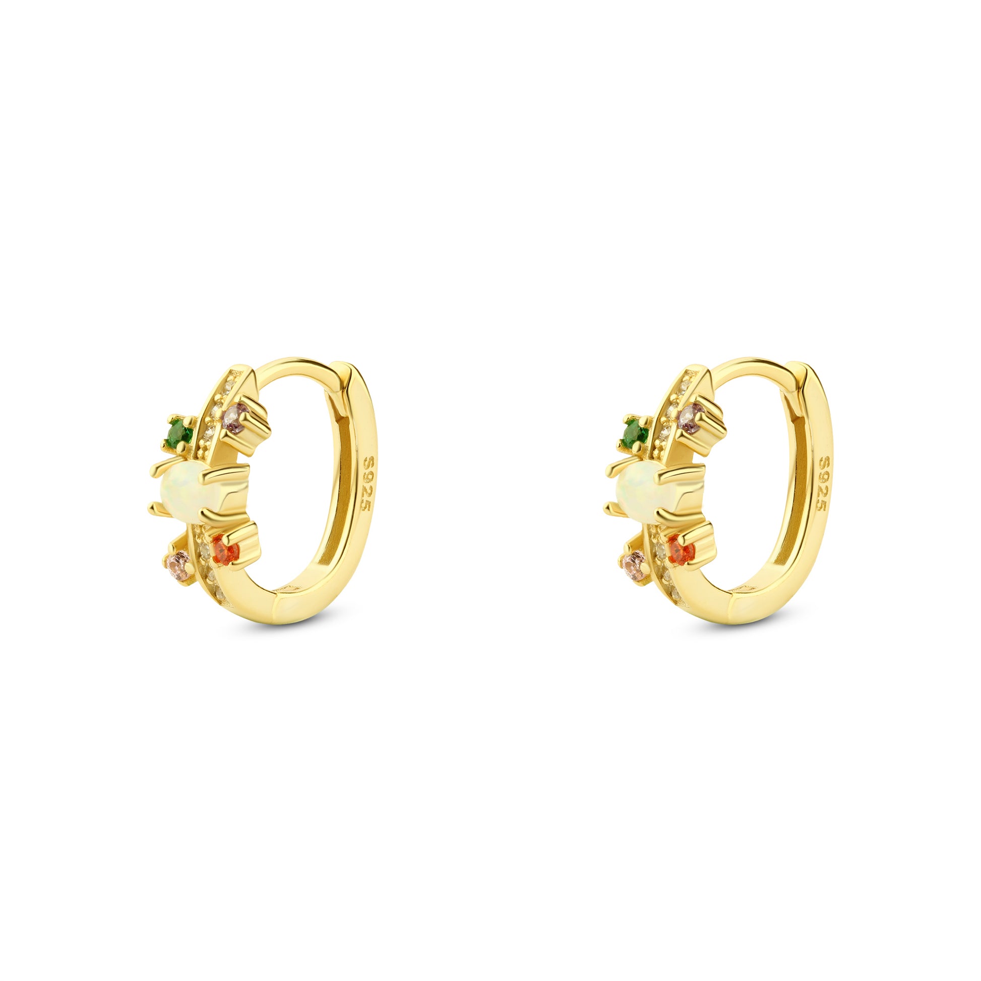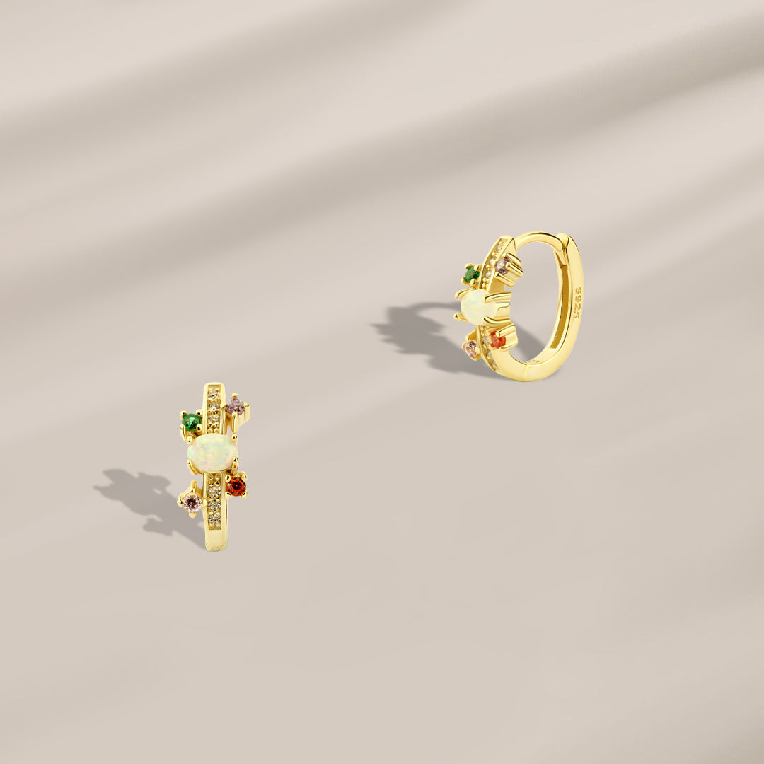 حلق فضة عيار 925 مطلي بالذهب بحجر أوبال وأحجار ملونة هو قطعة مجوهرات أنيقة تجمع بين الألوان الجذابة والبريق العصري في تصميم دائري مميز. يتميز حلق فضة عيار 925 مطلي ذهب بحجر أوبال أبيض لامع في المنتصف يعكس الضوء بألوان ناعمة، محاط بأحجار صغيرة ملونة تضيف لمسة من الحيوية والجمال إلى التصميم.