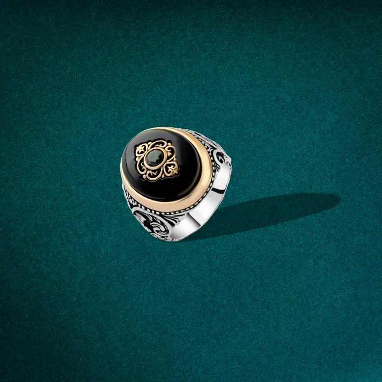 خاتم رجالي فاخر مستوحى من طراز السلاطين، مصاغ بعناية من الفضة التركية النقية عيار 925، ومطلي بطبقة من الاوكسيد الاسود لتعزيز المتانة ولمسة الفخامة. يتوسط الخاتم حجر أونيكس أسود لامع بتقطيع بيضاوي أنيق، يضفي حضورًا قويًا ويعكس الفخامة الذكورية بلمسة شرقية. يحيط بالحجر إطار مزخرف يدويًا بزخارف عربية وأشكال هندسية دقيقة، بينما تزين جوانب الخاتم سلاسل محفورة ونقوش بارزة تمنح التصميم عمقًا بصريًا مميزًا. كل تفصيلة في الخاتم تعكس مزاج السلاطين وتاريخهم، لتكون هذه القطعة الخيار الأمثل للرجل الذي يبحث عن إطلالة مهيبة تجمع بين القوة والأناقة الكلاسيكية.