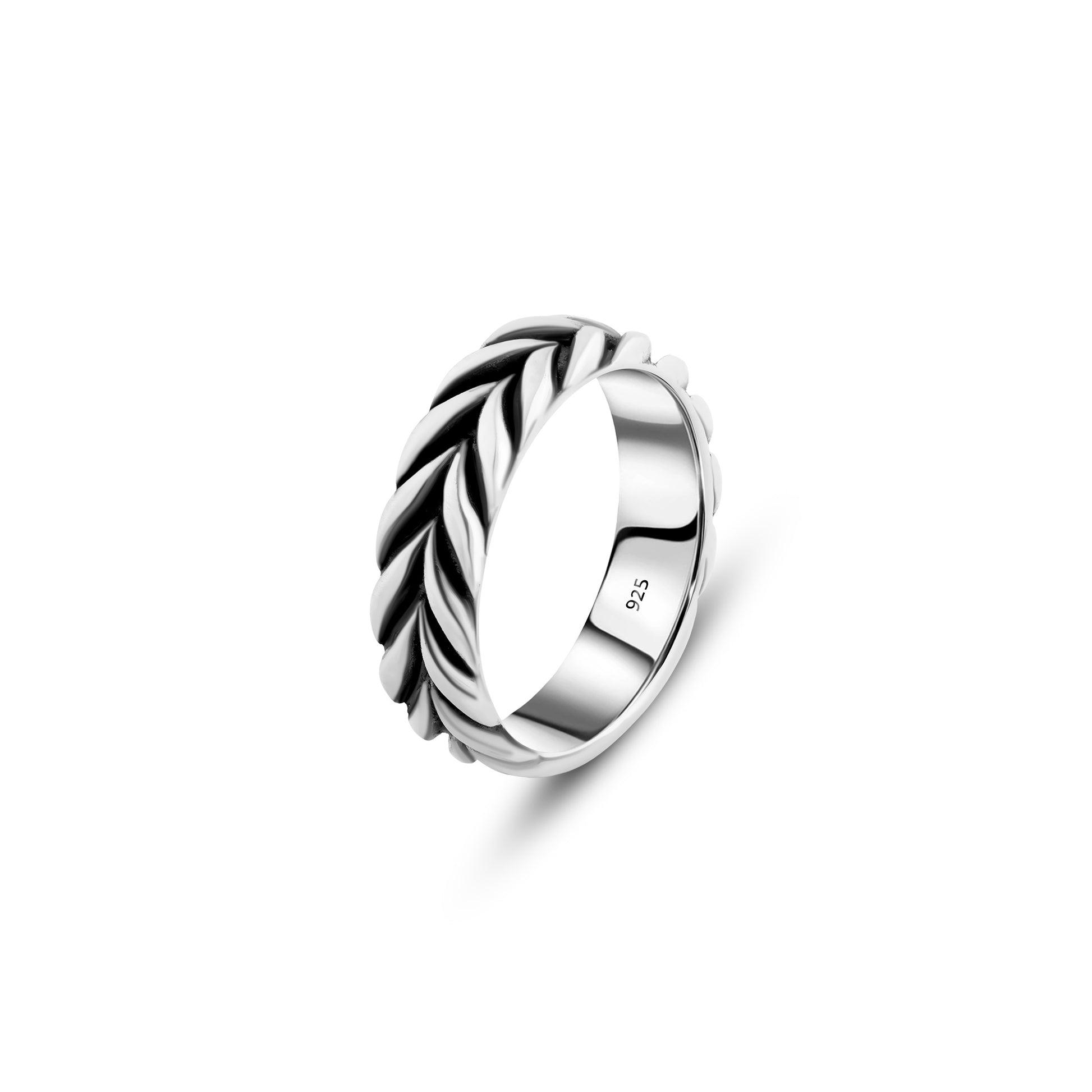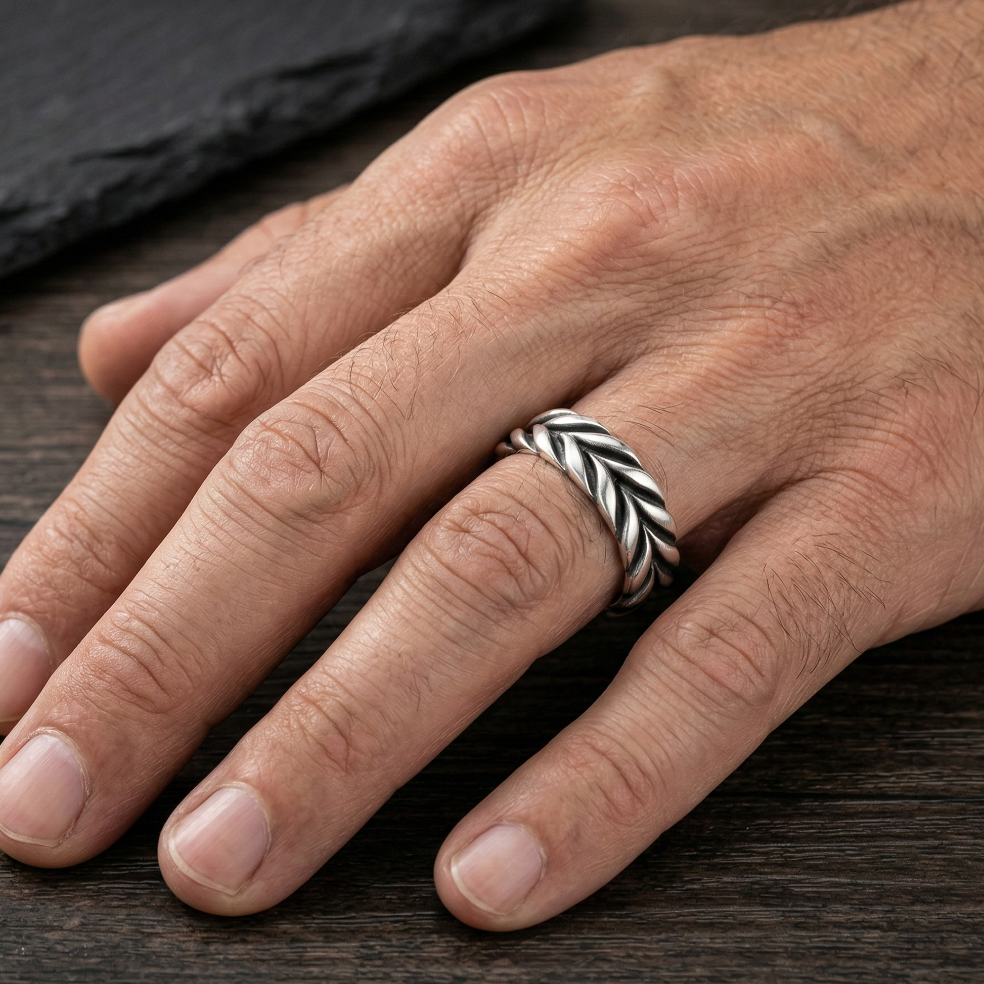 خاتم رجالي فضة بتصميم مجدول أنيق إطلالة مميزة تجمع بين العصرية، الفخامة، والتفاصيل الدقيقة في تصميم يعكس الذوق الراقي. يأتي الخاتم مصنوعًا من فضة عيار 925 عالية الجودة، مع تصميم مجدول مستوحى من شكل الحبل الملتف يضيف لمسة فنية جذابة ولمظهر ثلاثي الأبعاد يعكس العمق والتميز.