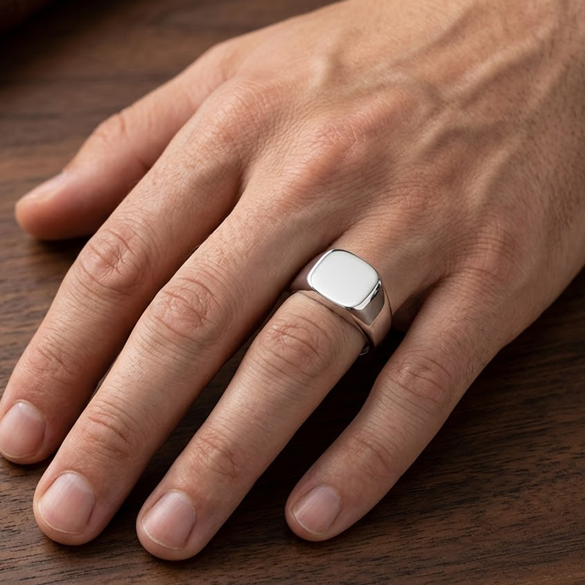 يمنحك خاتم رجالي فضة سادة بواجهة مربعة مظهرًا أنيقًا يجمع بين البساطة، العصرية، والفخامة الهادئة في تصميم يعكس الذوق الراقي. يأتي الخاتم مصنوعًا من فضة عيار 925 عالية الجودة، مع واجهة مربعة ملساء تمنحه طابعًا حديثًا ومميزًا، مع إمكانية النقش لإضافة لمسة شخصية فريدة.