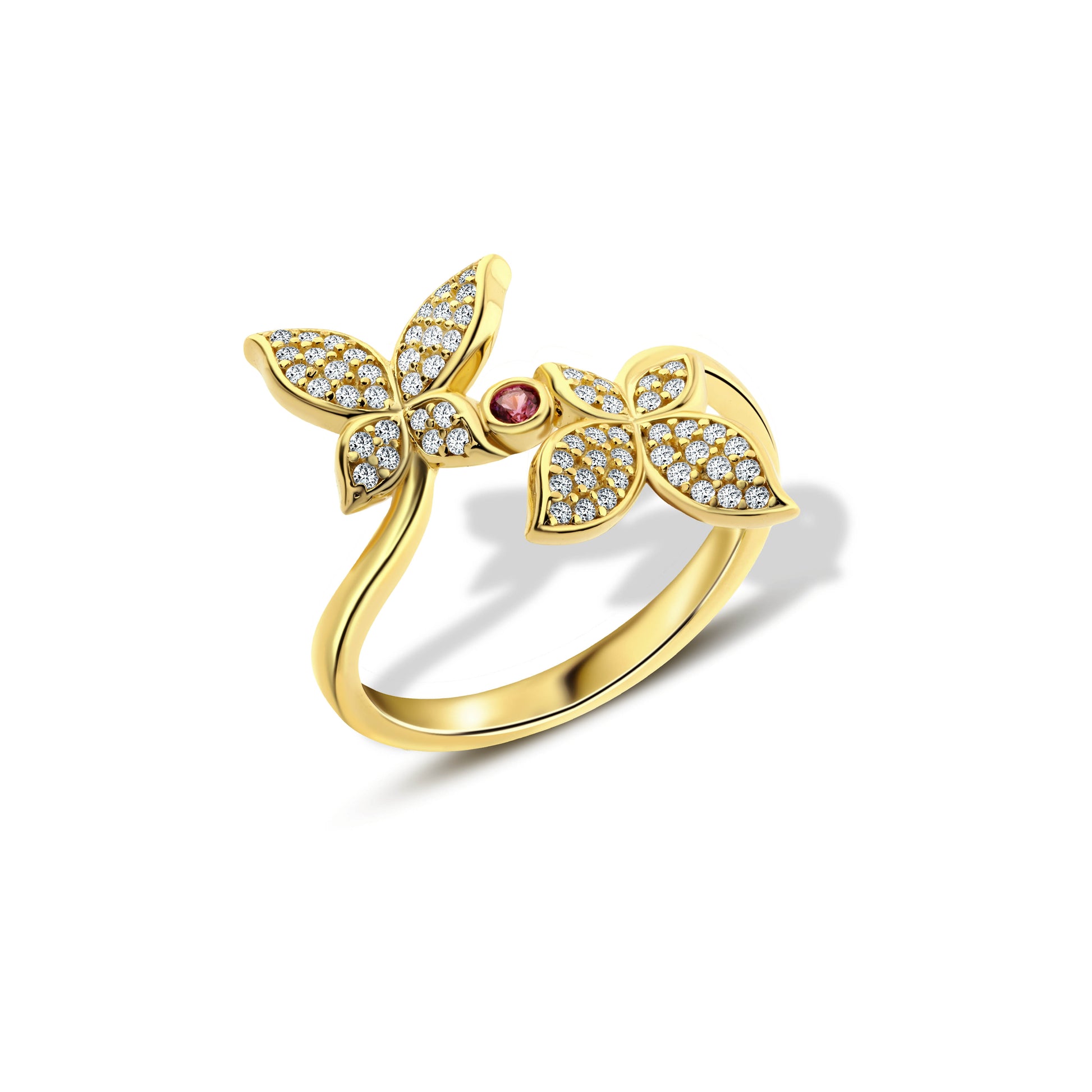 خاتم فراشة بحجر وردي في المنتصف فضة عيار 925 مطلي ذهب