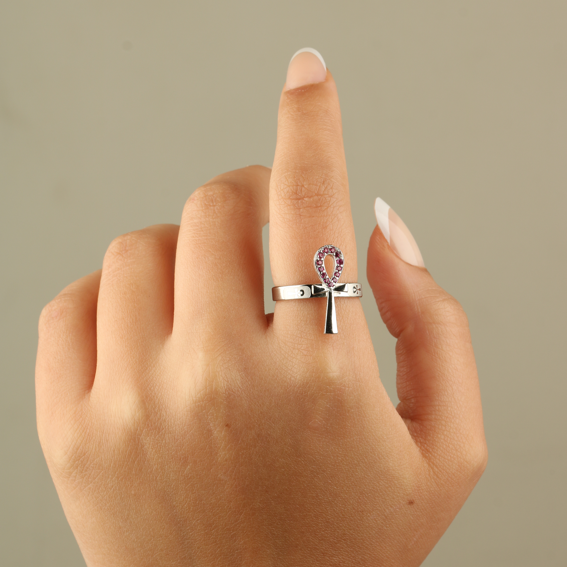 خاتم فرعوني بتصميم مفتاح الحياه فضة 925 مرصع بفصوص الزركون الوردي