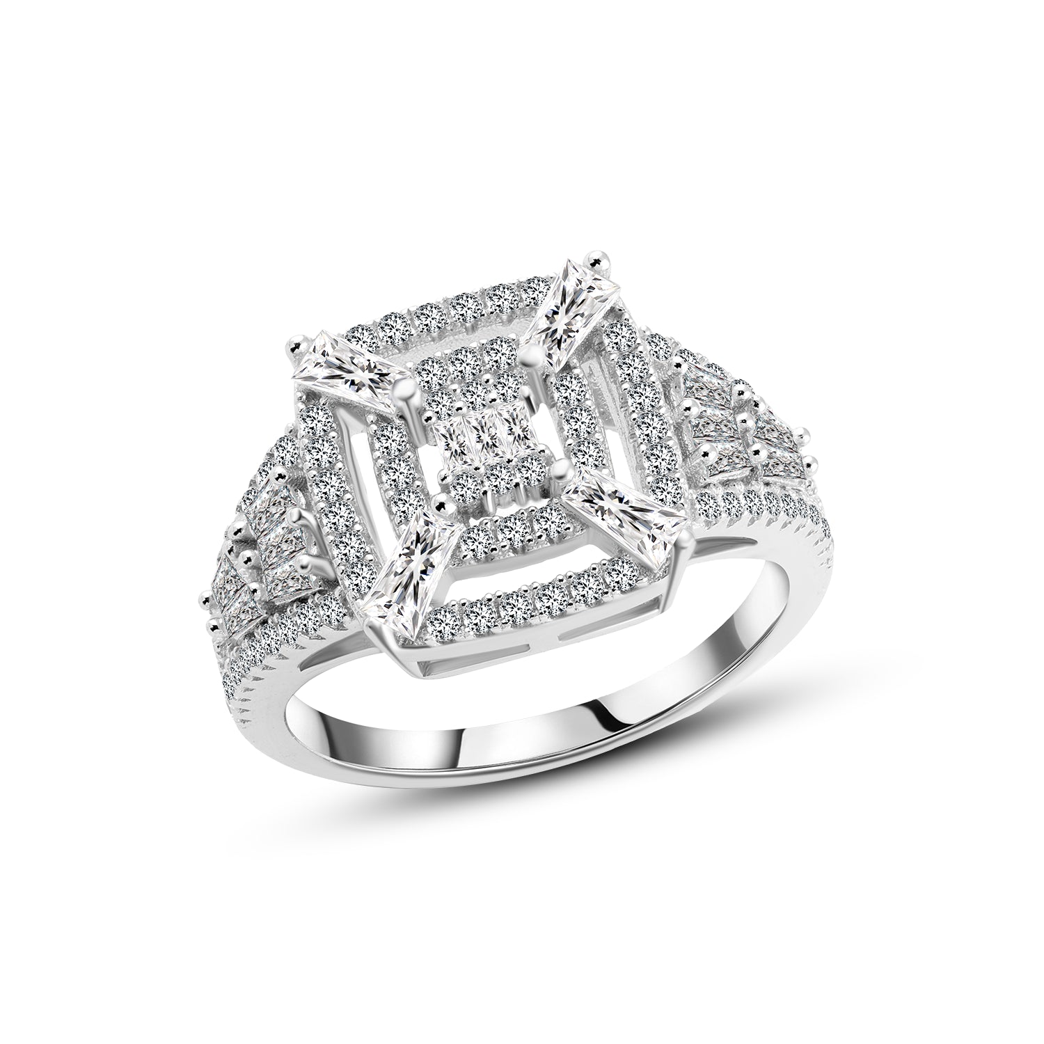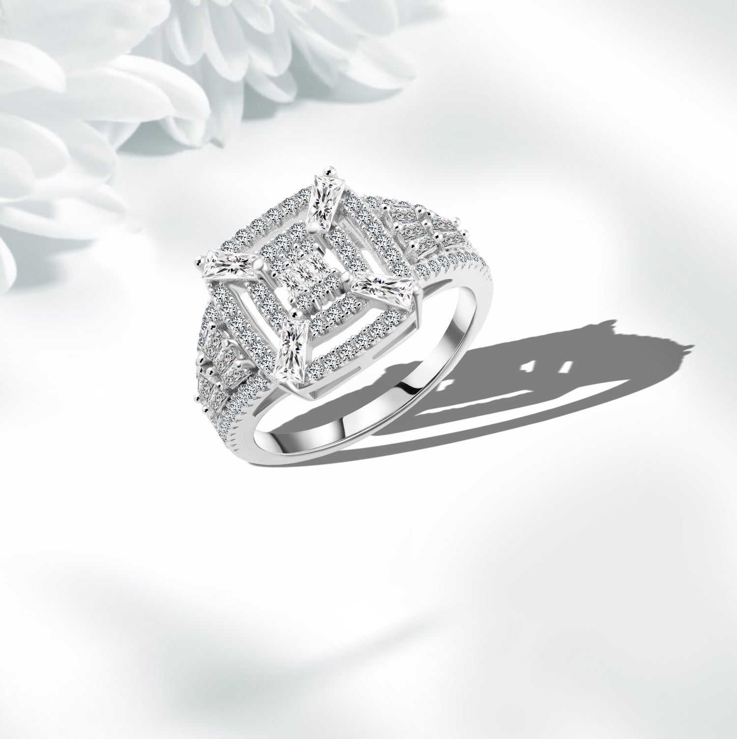 خاتم فضة عيار 925 فاخر بتصميم هندسي راقٍ يجمع بين الفخامة والدقة في التفاصيل. يتميز بفصوص زركون براقة بأشكال متعددة (مربعة ومستطيلة ودائرية) مرتبة بطريقة فنية تمنح الخاتم مظهرًا ملكيًا يخطف الأنظار.