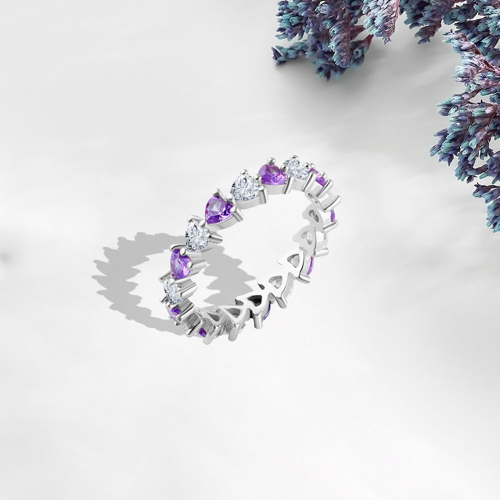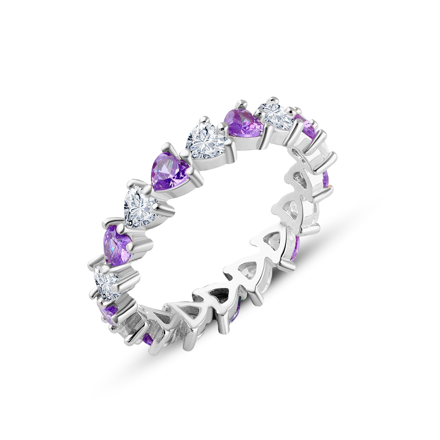 يزدان الخاتم بصفوف متتابعة من فصوص الزركون البنفسجية والشفافة على شكل قلوب، تمتد حول الخاتم بالكامل في تناغم يرمز للحب والجمال.