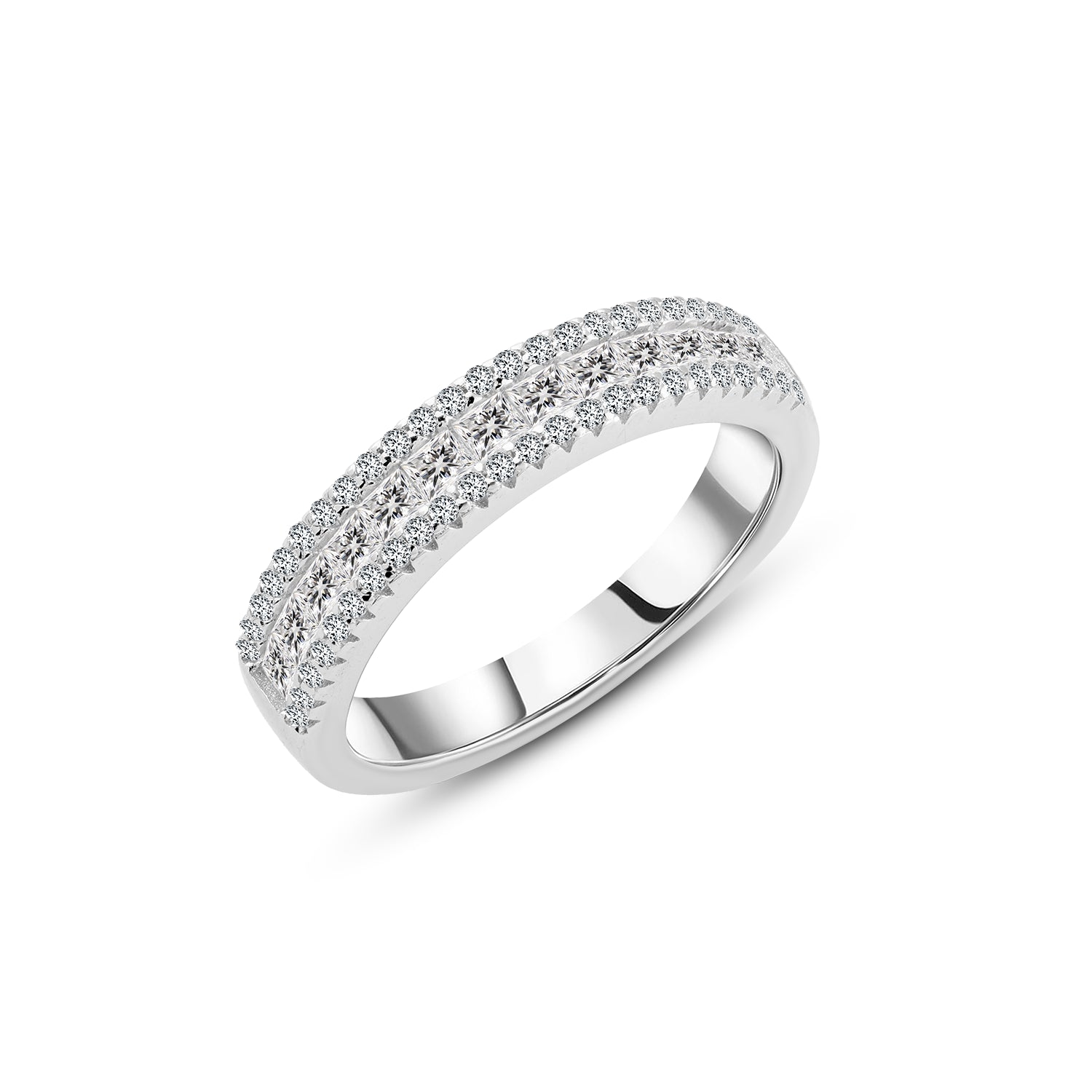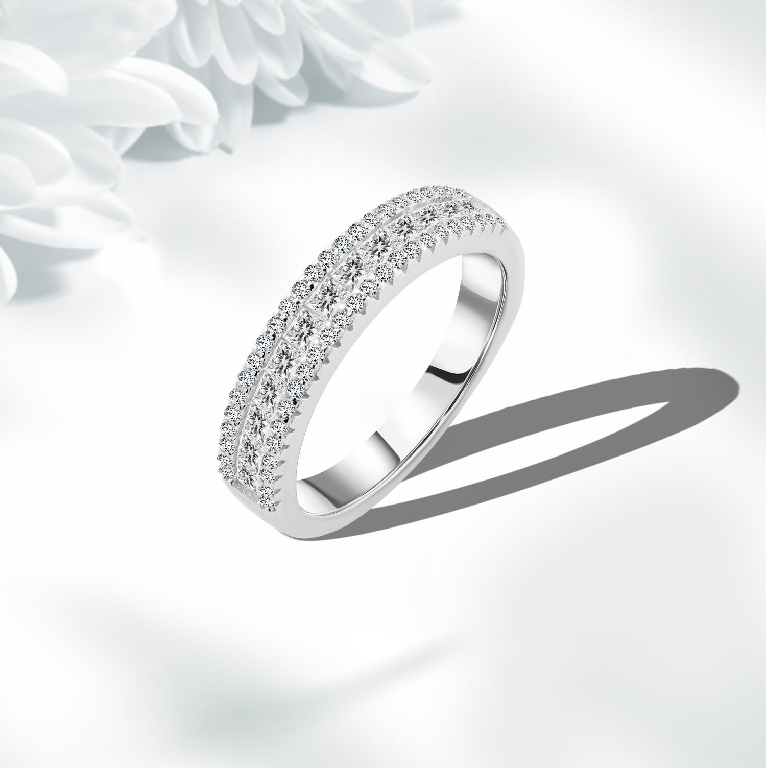 خاتم فضة عيار 925 مطلي بالبلاتين الفاخر بتصميم أنيق يجمع بين البساطة والرقي. يتميز بصفّين من فصوص الزركون اللامعة التي تضيف لمسة براقة تخطف الأنظار في أي مناسبة.
