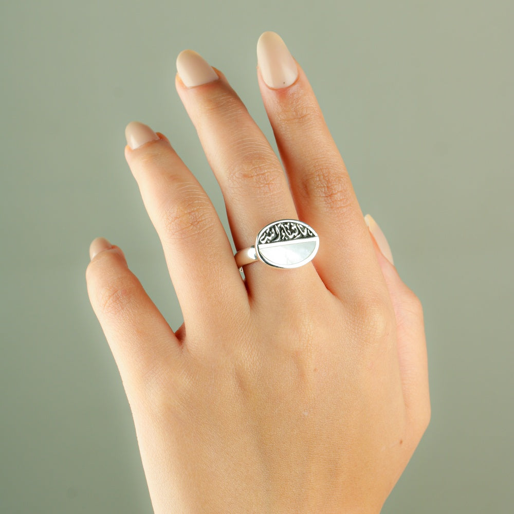 خاتم فضة مصري عيار 925 بحجر الصدف منقوش "ما شاء الله"