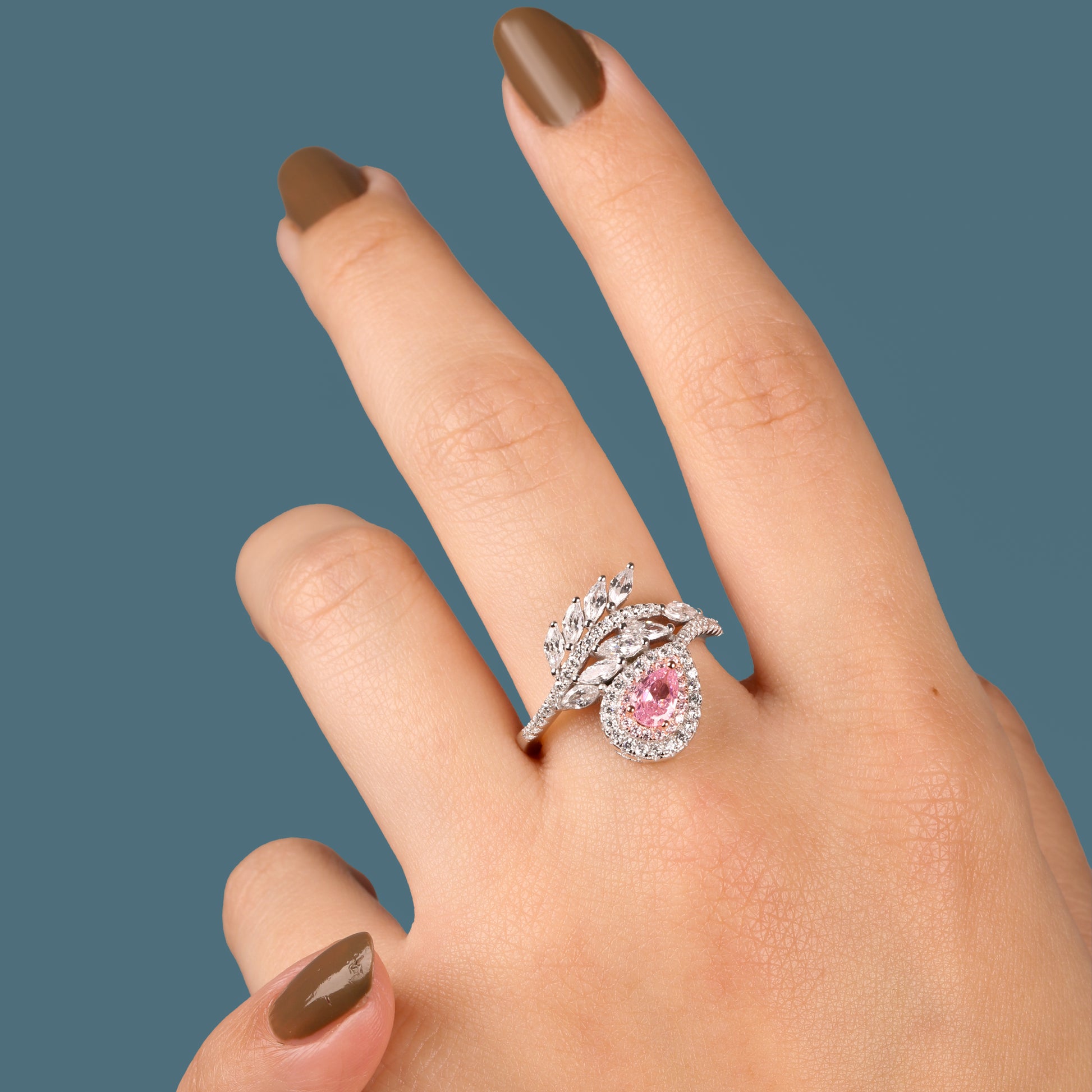 صُنع هذا الخاتم من فضة أصلية عيار 925 عالية الجودة، ومرصّع بحجر وردي لامع يتوسطه تصميم أنيق على شكل ورقة، ليمنحك إطلالة ناعمة مليئة بالجاذبية والفخامة.