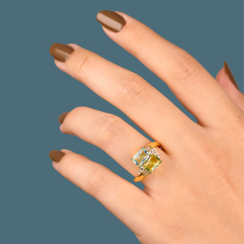 خاتم ذهبي بحجرين مربّعين لامعين من فتحي إبراهيم هو قطعة فنية تجمع بين الفخامة والجرأة في تصميم واحد ينبض بالعصرية والأناقة. يتميز هذا الخاتم الذهبي الراقي بتصميم عصري مصنوع من معدن ذهبي لامع يمنح القطعة حضورًا فخمًا، تتوسطه حجران مربّعان كبيران بلونين مختلفين يضيفان توازنًا رائعًا بين الأناقة الكلاسيكية واللمسة الجريئة الحديثة.