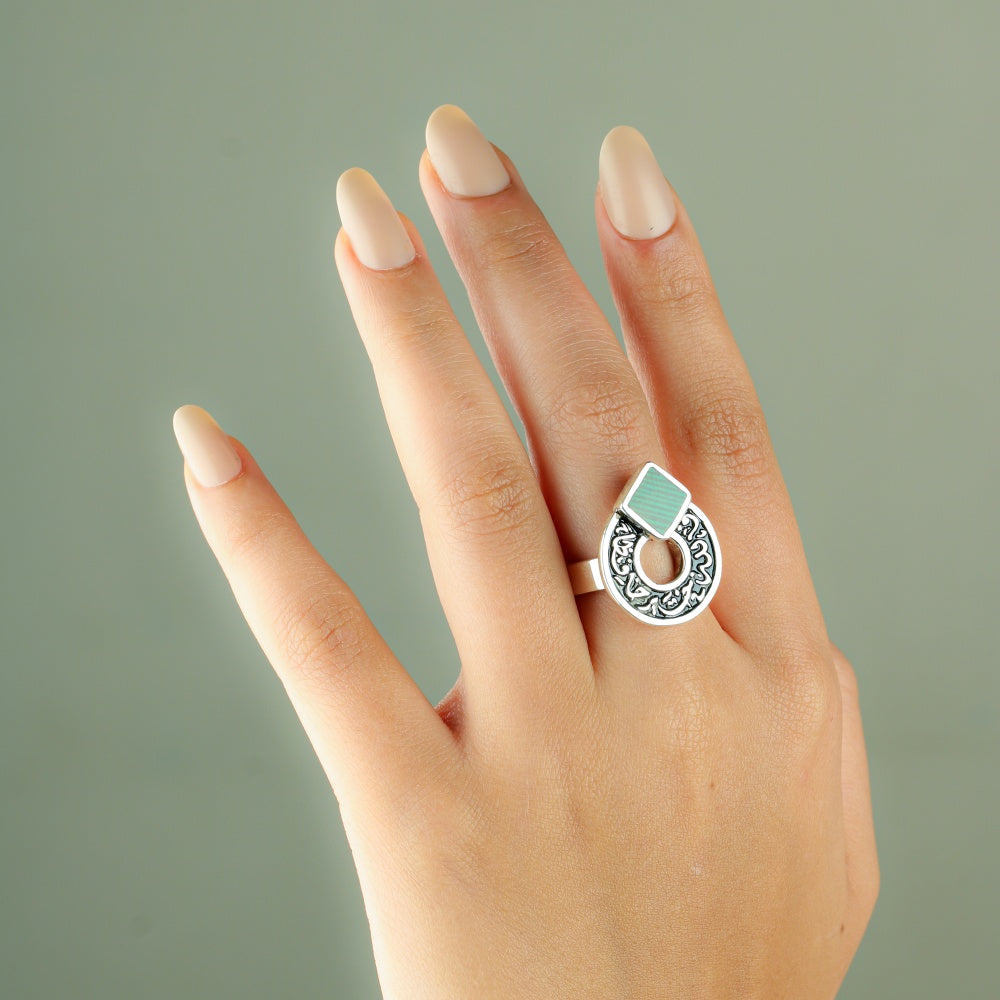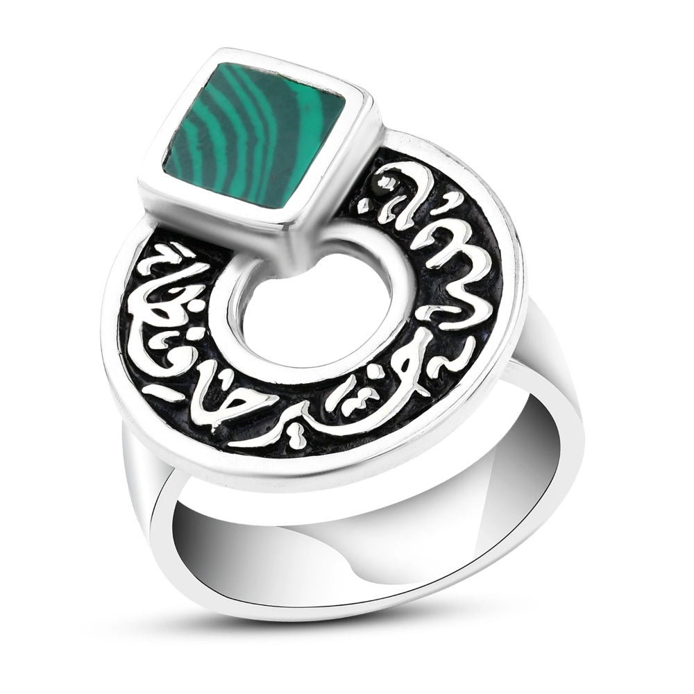 خاتم أنيق مصنوع من الفضة بتصميم دائري فني مفتوح، يعلوه حجر ملكيت بلونه الأخضر الغني وتعرجاته الطبيعية المتناغمة. يحيط بالحجر إطار محفور بعبارة قرآنية مميزة "فالله خيرٌ حافظًا" بخط عربي أنيق، ما يمنح الخاتم طابعًا إيمانيًا وروحيًا عميقًا. تصميم يجمع بين جمال الحرفة ودلالات الحماية والبركة، ليكون قطعة مثالية لمحبي المجوهرات ذات الطابع المعنوي والهوية العربية الأصيلة.