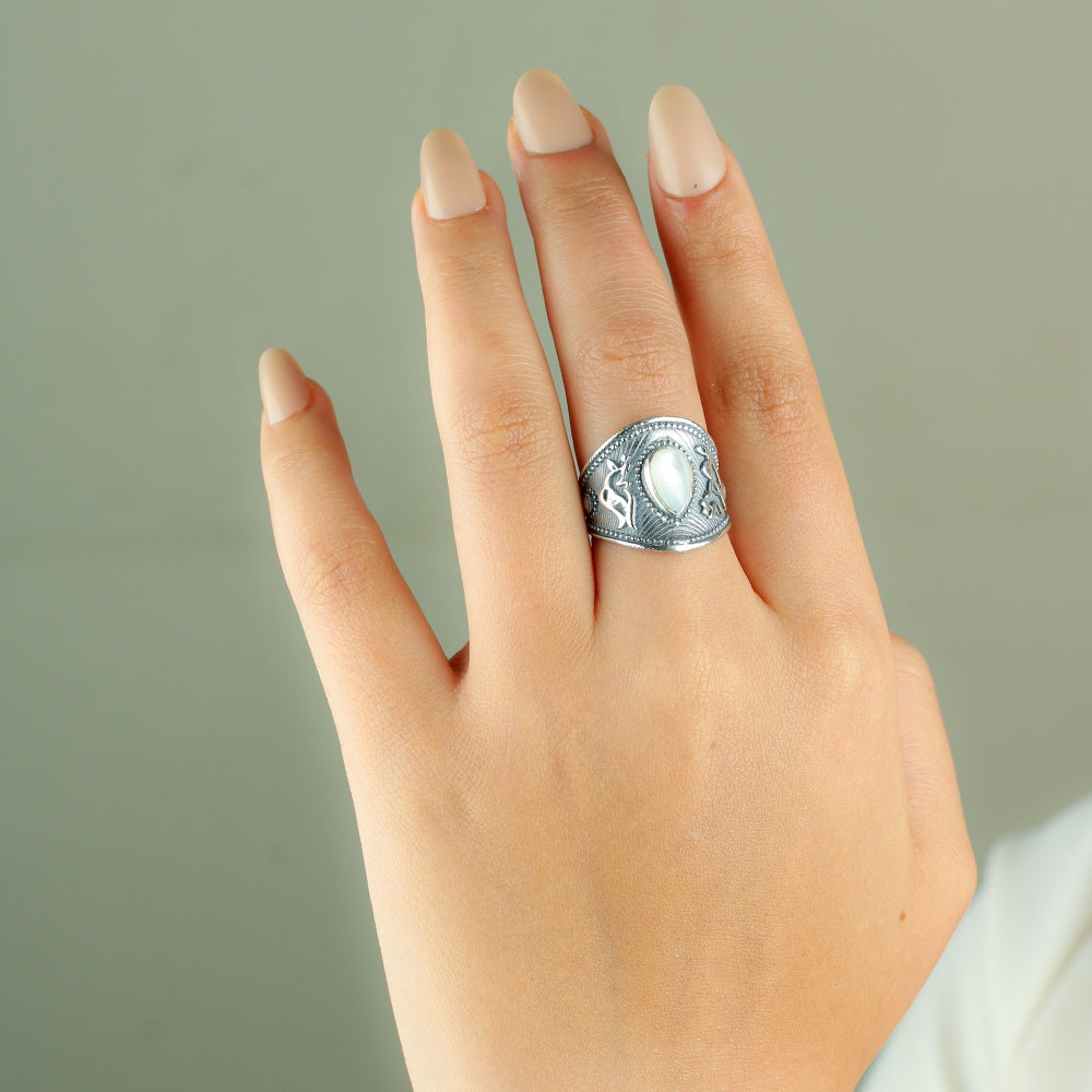 خاتم فضة نسائي عيار 925 بتصميم مستوحى من الطراز العثماني الفاخر. يتميز الخاتم بحجر الصدف الطبيعي الذي يضيف لمسة من الأناقة والرقي. التصميم الفريد يعكس جمال التفاصيل العريقة، مما يجعله قطعة مثالية لمحبي الإكسسوارات الكلاسيكية ذات الطابع التاريخي. مناسب للاستخدام اليومي أو للمناسبات الخاصة، ويعد هدية مثالية لمن يقدرون الحرفية الراقية.