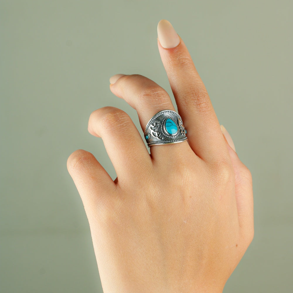 خاتم فضه حريمي عيار925 مستوحي من الطراز العثماني وحجر فيروزي