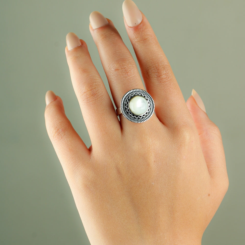 خاتم دائري فاخر مصنوع من أجود أنواع الفضة عيار 925، يتوسطه حجر الصدف الطبيعي بلونه الأبيض الصدفي المتلألئ الذي يعكس لمسة من النقاء والرقي. تصميمه الكلاسيكي يجمع بين البساطة والجمال، ليكون قطعة مثالية تزين إطلالتك اليومية أو تضيف لمسة راقية في المناسبات الخاصة.