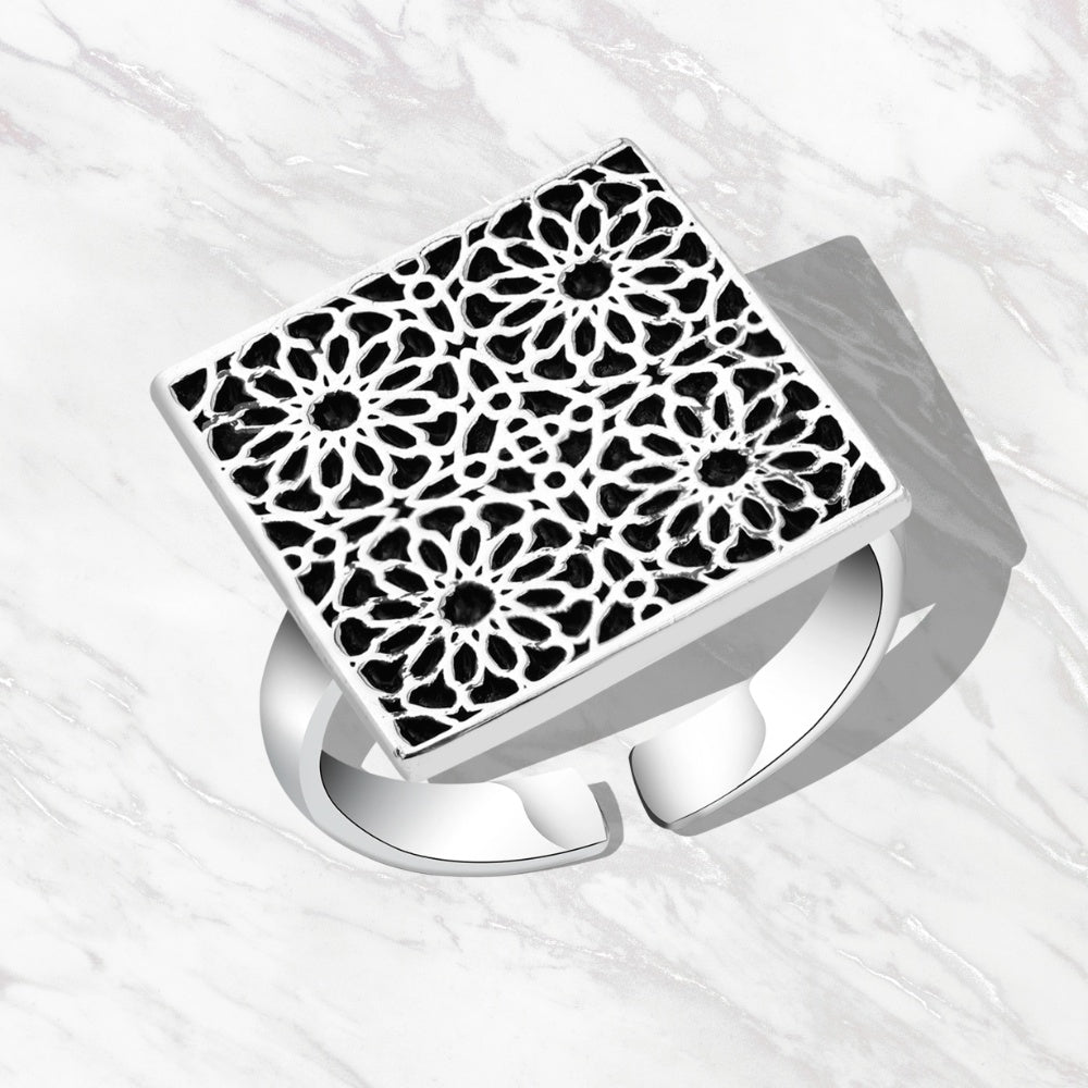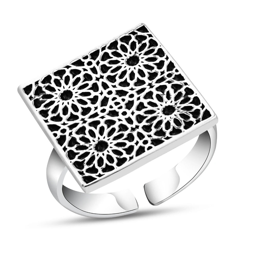خاتم فضة أنيق بتصميم هندسي فريد على شكل مربع مزخرف بزخارف نباتية دقيقة تمنحه طابعًا شرقيًا مميزًا، مطلي بأوكسيد أسود لإبراز تفاصيل النقوش بشكل واضح يضفي على الخاتم عمقًا وجاذبية خاصة، مناسب للاستخدام اليومي أو كقطعة إكسسوار لافتة في المناسبات، ويجمع بين العراقة والحداثة في آن واحد.