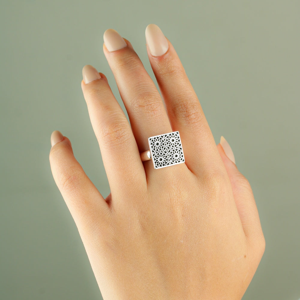 خاتم فضة أنيق بتصميم هندسي فريد على شكل مربع مزخرف بزخارف نباتية دقيقة تمنحه طابعًا شرقيًا مميزًا، مطلي بأوكسيد أسود لإبراز تفاصيل النقوش بشكل واضح يضفي على الخاتم عمقًا وجاذبية خاصة، مناسب للاستخدام اليومي أو كقطعة إكسسوار لافتة في المناسبات، ويجمع بين العراقة والحداثة في آن واحد.