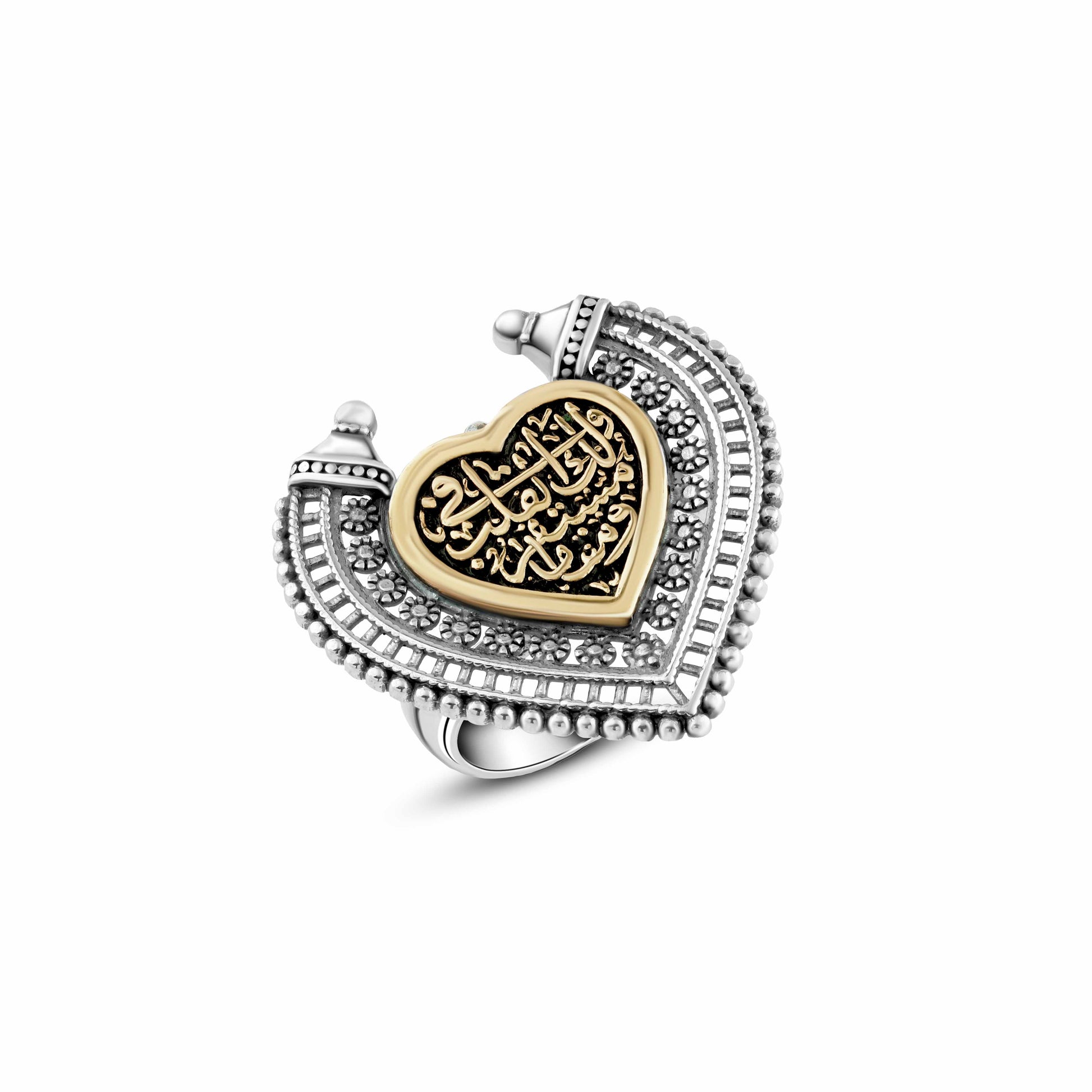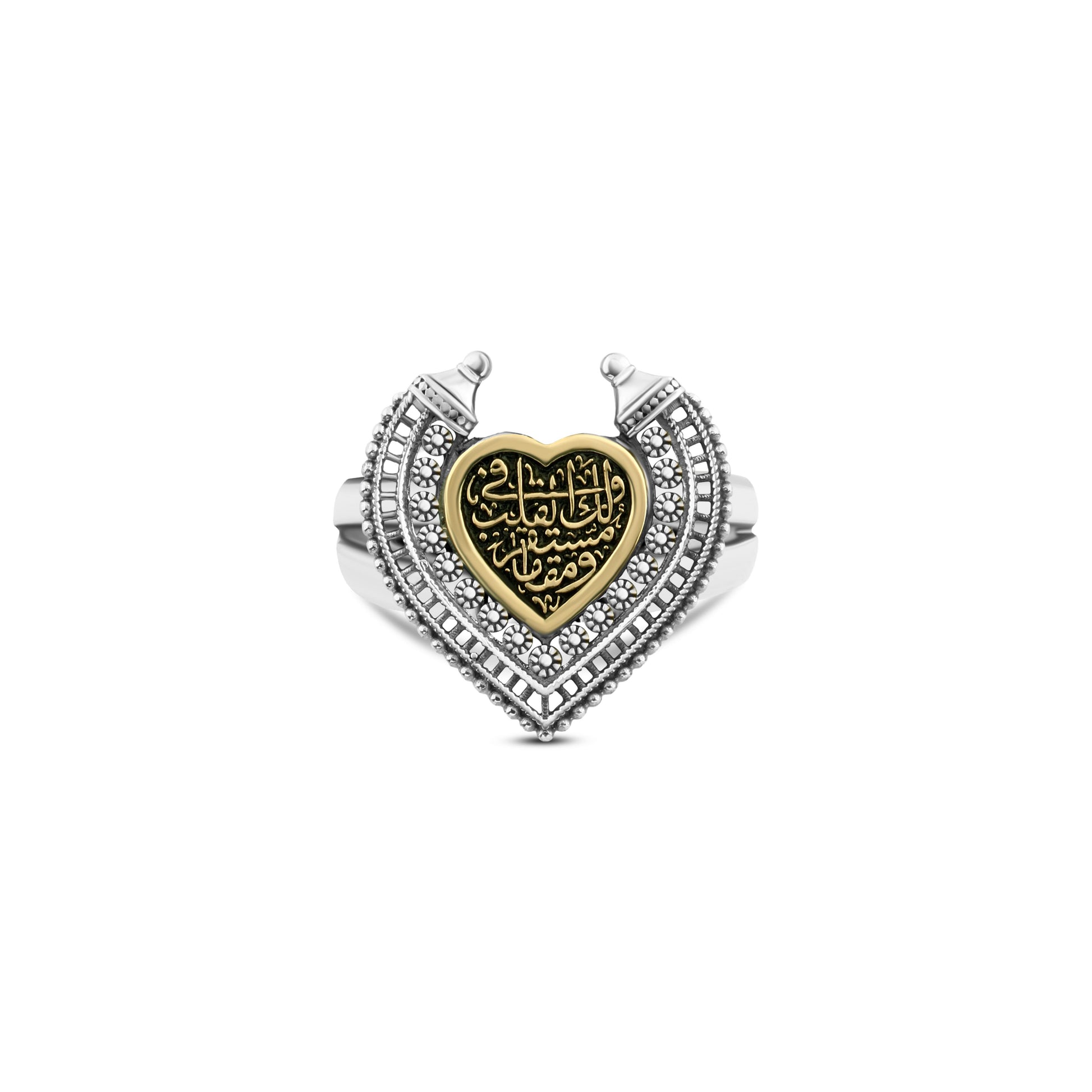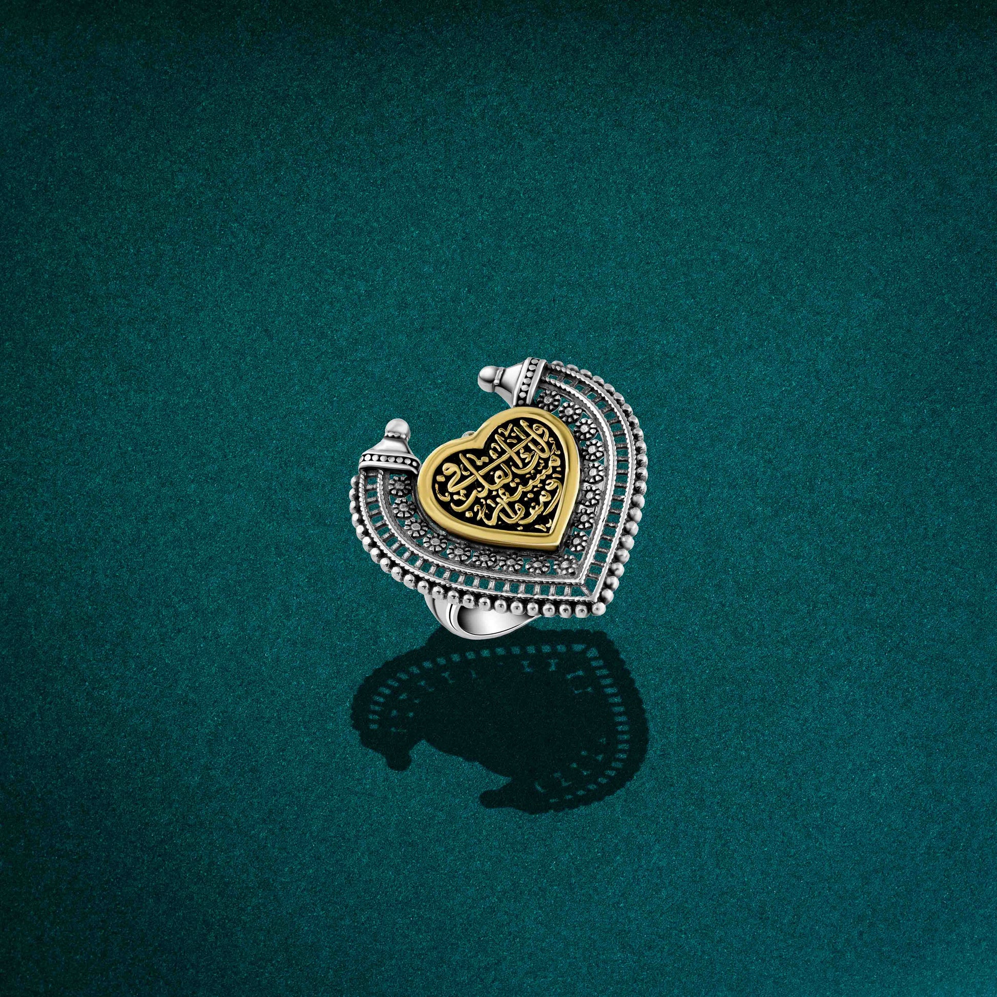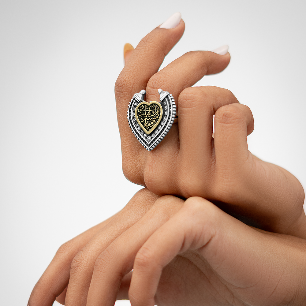 القلب المذهّب يضيف لمسة فخامة هادئة تبرز النقش العربي وتمنحه حضورًا مميزًا، ليصبح الخاتم أكثر من مجرد إكسسوار، بل رسالة عاطفية صادقة يمكن إهداؤها لشخص له قيمة حقيقية. اختيار مثالي لمن يقدّر الرمزية، الذوق العربي الأصيل، والتصميم الذي يحمل معنى يدوم مع الوقت. قطعة تعبّر عن هوية وفخامة فتحي إبراهيم وخبرة طويلة في تقديم مشغولات راقية تحمل قيمة وشعورًا صادقًا.