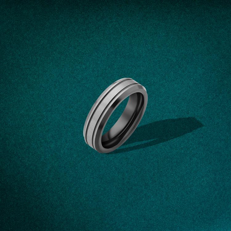 دبلة رجالي راقية مصنوعة من معدن التنجستين المعروف بصلابته ومتانته، بتصميم أسود أنيق يتوسطه خط فضي عصري يمنحه لمسة مميزة تجمع بين القوة والفخامة.